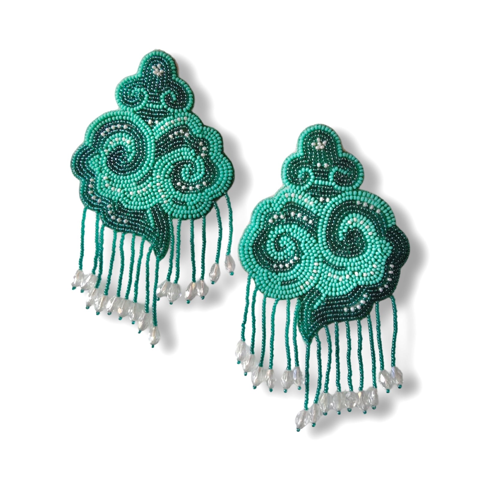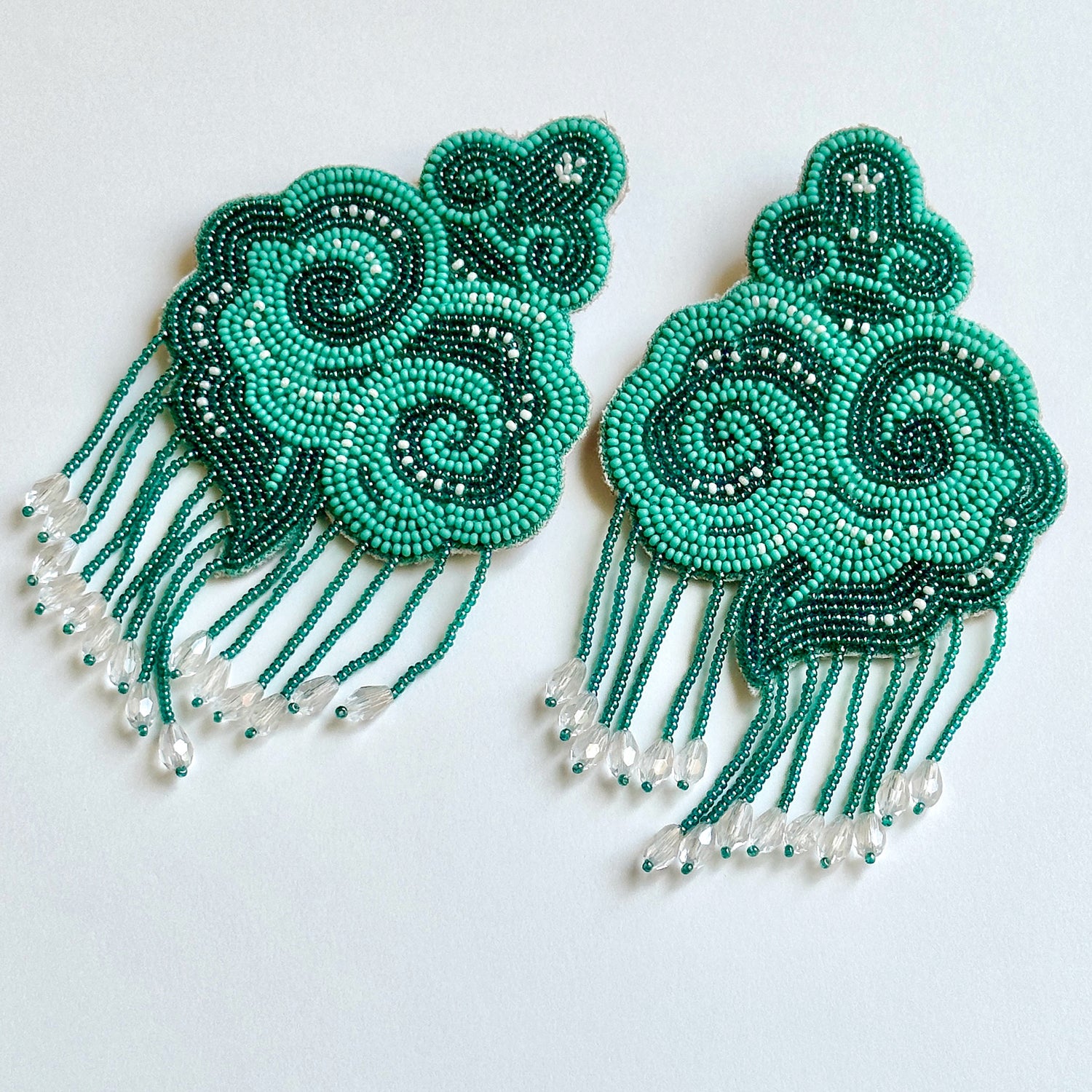 Statement cloud and raindrops inspired hand embroidered glass bead earrings. Made using hand embroidery technique on cotton base and velvet backing. Beautiful aqua color variation is inspired by seascapes. Pleasantly lightweight with all the visual impact of a gorgeous statement ear ornament!