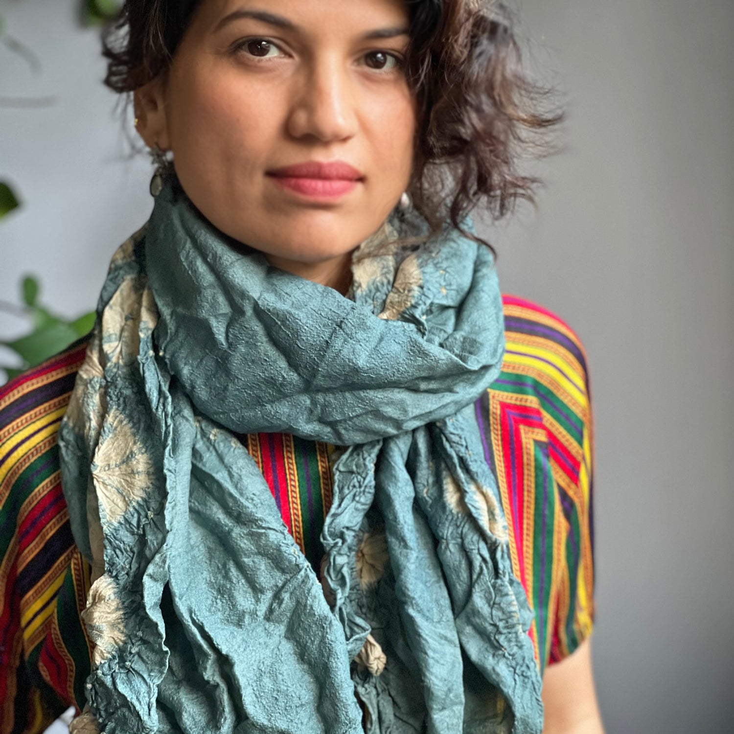 A celebration of creativity, craft and culture, this beautiful handwoven, hand tie dyed finest Tassar silk scarf has a very chic fiber sculptural feel to it! Contemporary tie dye arrangement using the heritage skill of Bandhni from Kutch region in rural India.
