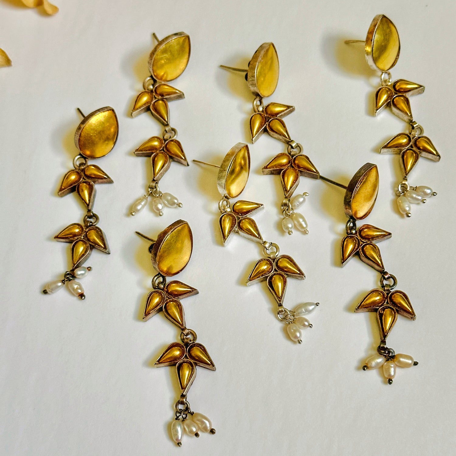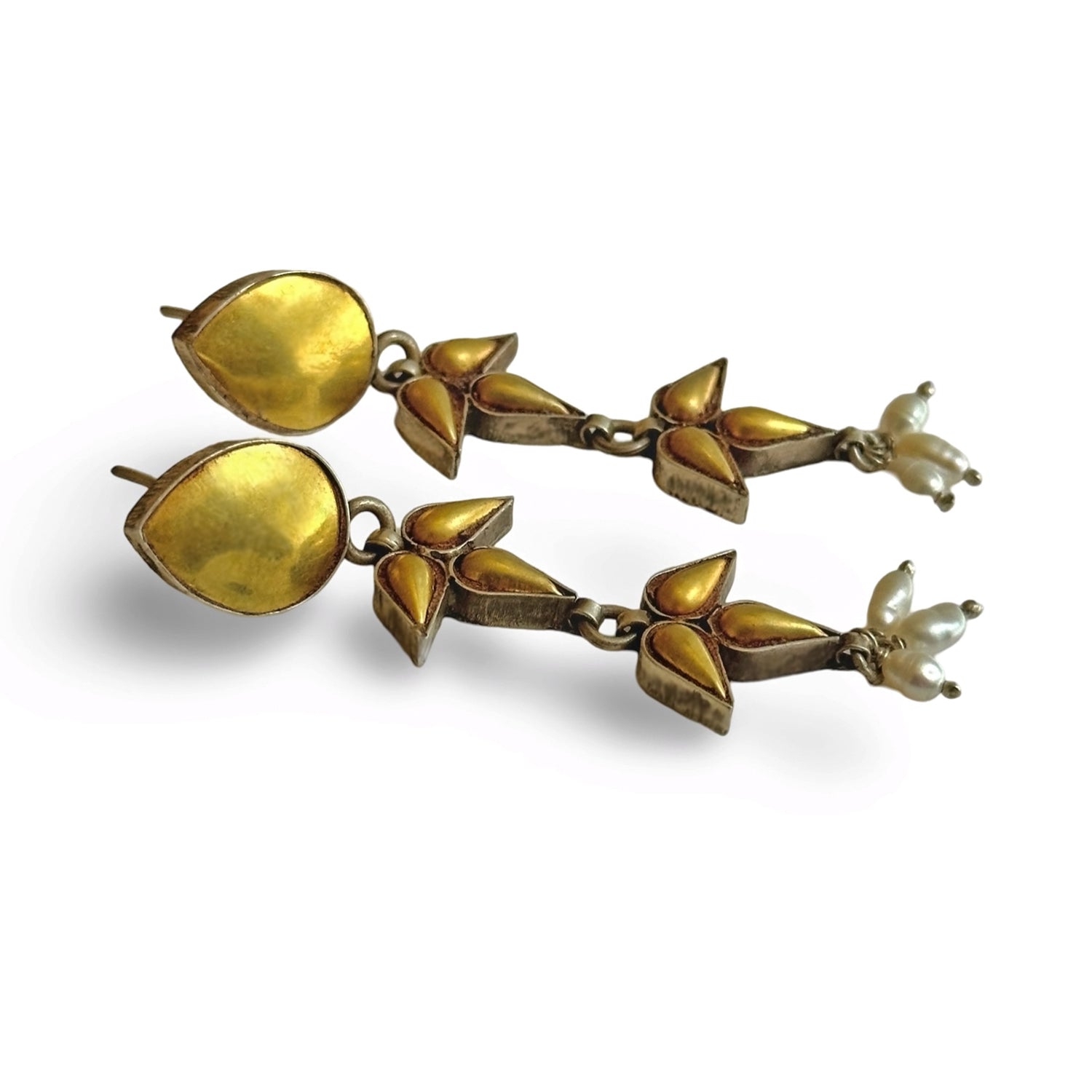 Shine bright in BANDLU 4 gold foil Post earrings, gorgeous gold foil work over oxidized sterling silver is sophisticated and elegant✨ Natural freshwater rice pearl dangles add a nice touch and movement!