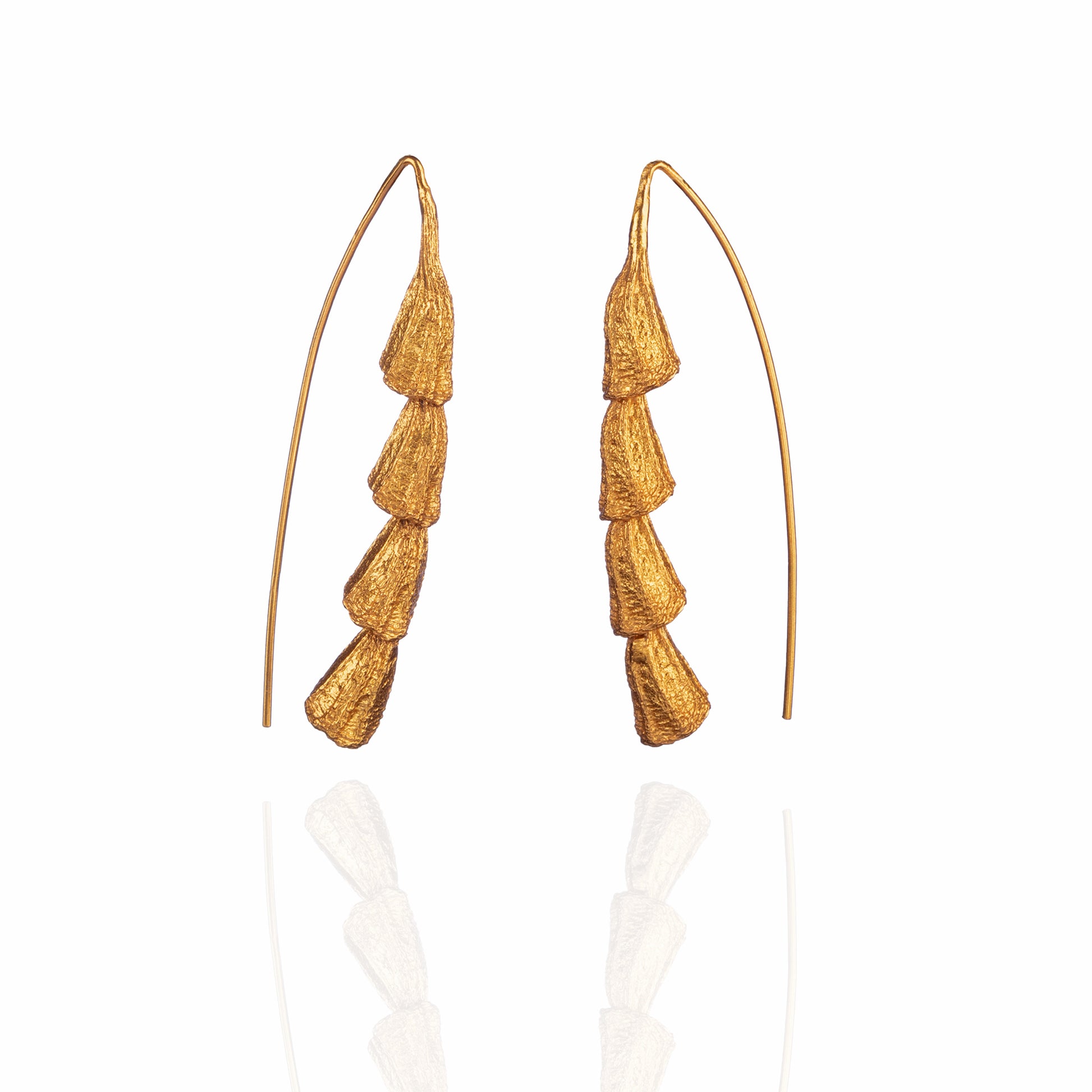 Fyoli Fyoli jewelry is all about finding joy and beauty in the natural world around us. Presenting Ammil gold plated elongated pod dangle ear hooks from our seedpod inspired series. Ammil refers to the glittering layer of ice that dusts leaves, twigs and grass after a freeze.