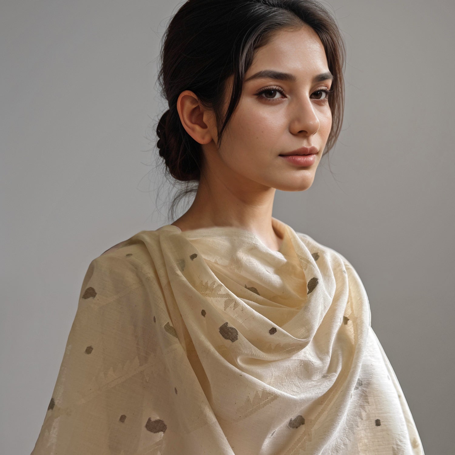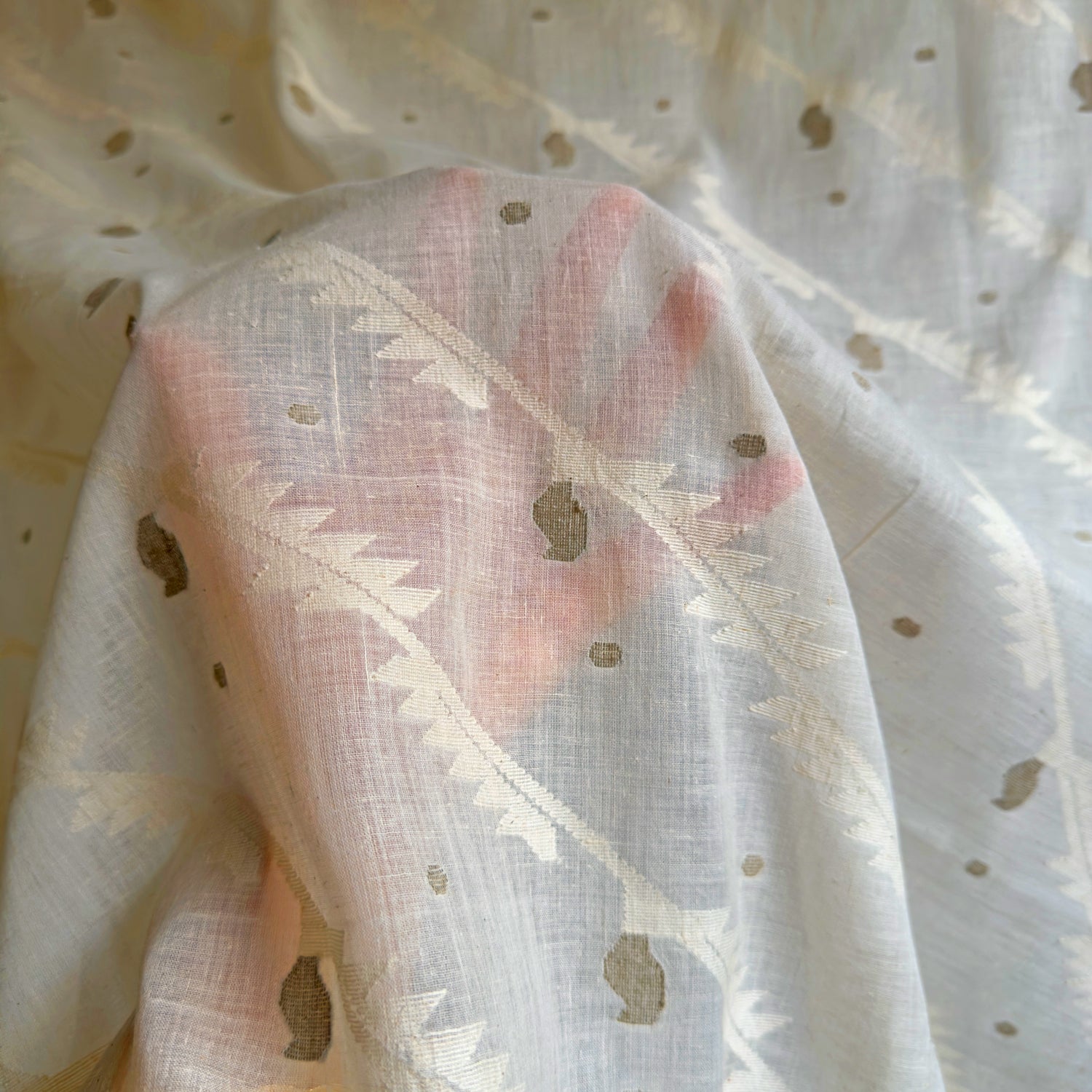 Soft, billowy, light as air, DAPNNE needlework Jamdani wrap in 150 count cotton handspun cotton weft and warp. This scarf is made using undyed, unbleached kora cotton and naturally green organic cotton and naturally brown organic cotton variation. Last picture shows reverse of the fabric and the characteristic U turns of the authentic needlework Jamdani supplementary weft technique.