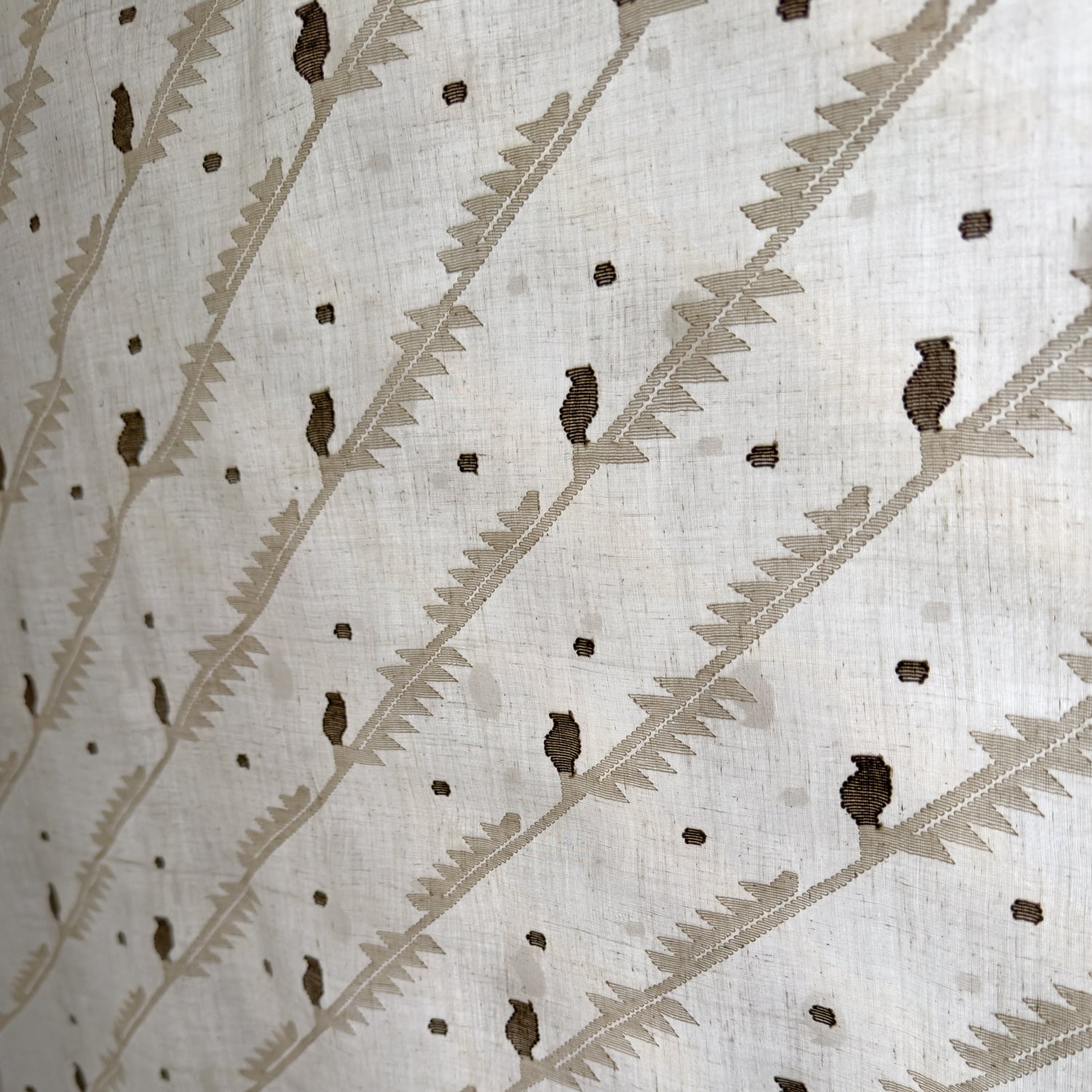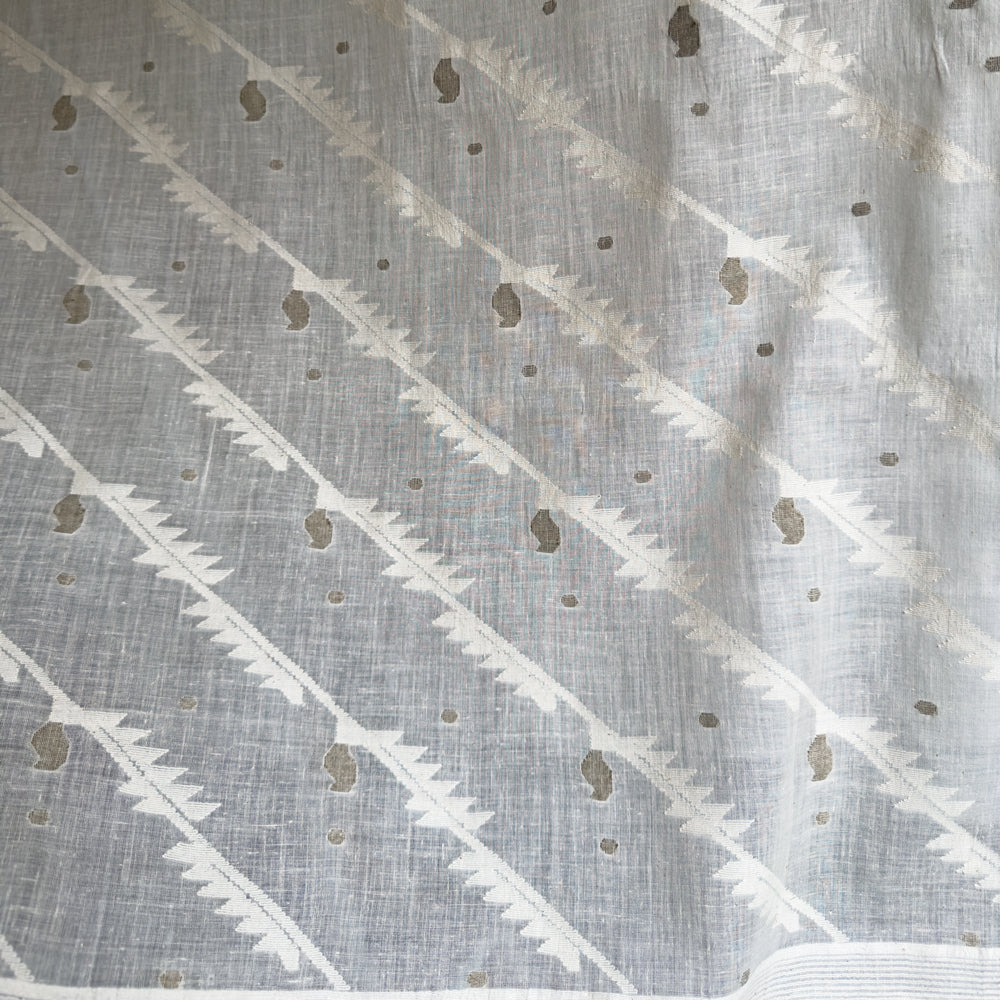 A contemporary take on the heritage Jamdani weave of West Bengal (a UNESCO intangible heritage) in this remarkable diagonal design. Jamdani is a supplementary extra weft hand weaving technique akin to on loom needle embroidery. Thicker yarns are used to create motifs over finer base yarns using a metal needle tool called Shola, creating a beautiful interplay of light and transparency.