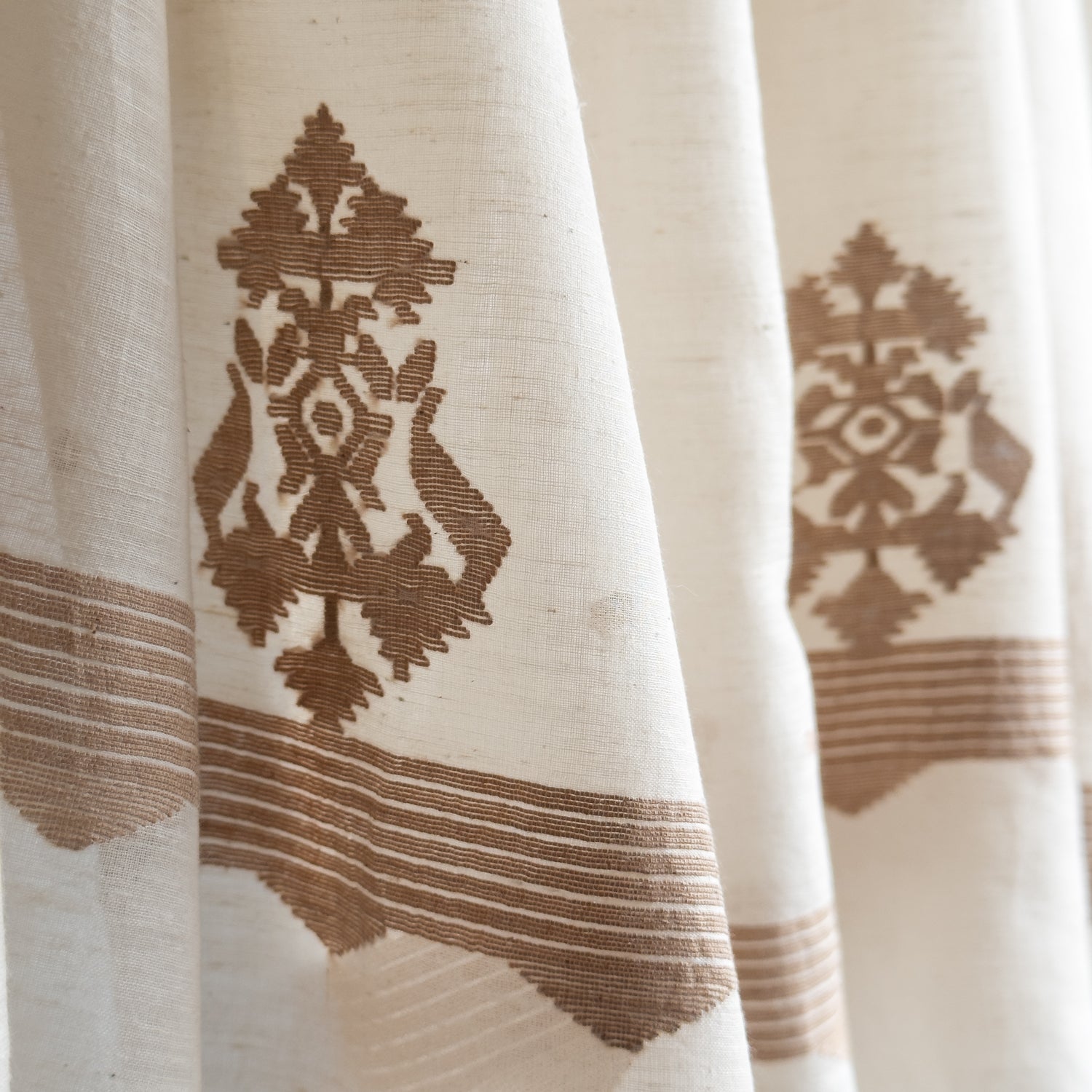Soft, billowy, light as air, FREYA needlework Jamdani wrap in 200 count cotton handspun weft and 120 count millspun cotton warp. This scarf is made using undyed, unbleached kora cotton and naturally brown organic cotton as accent.