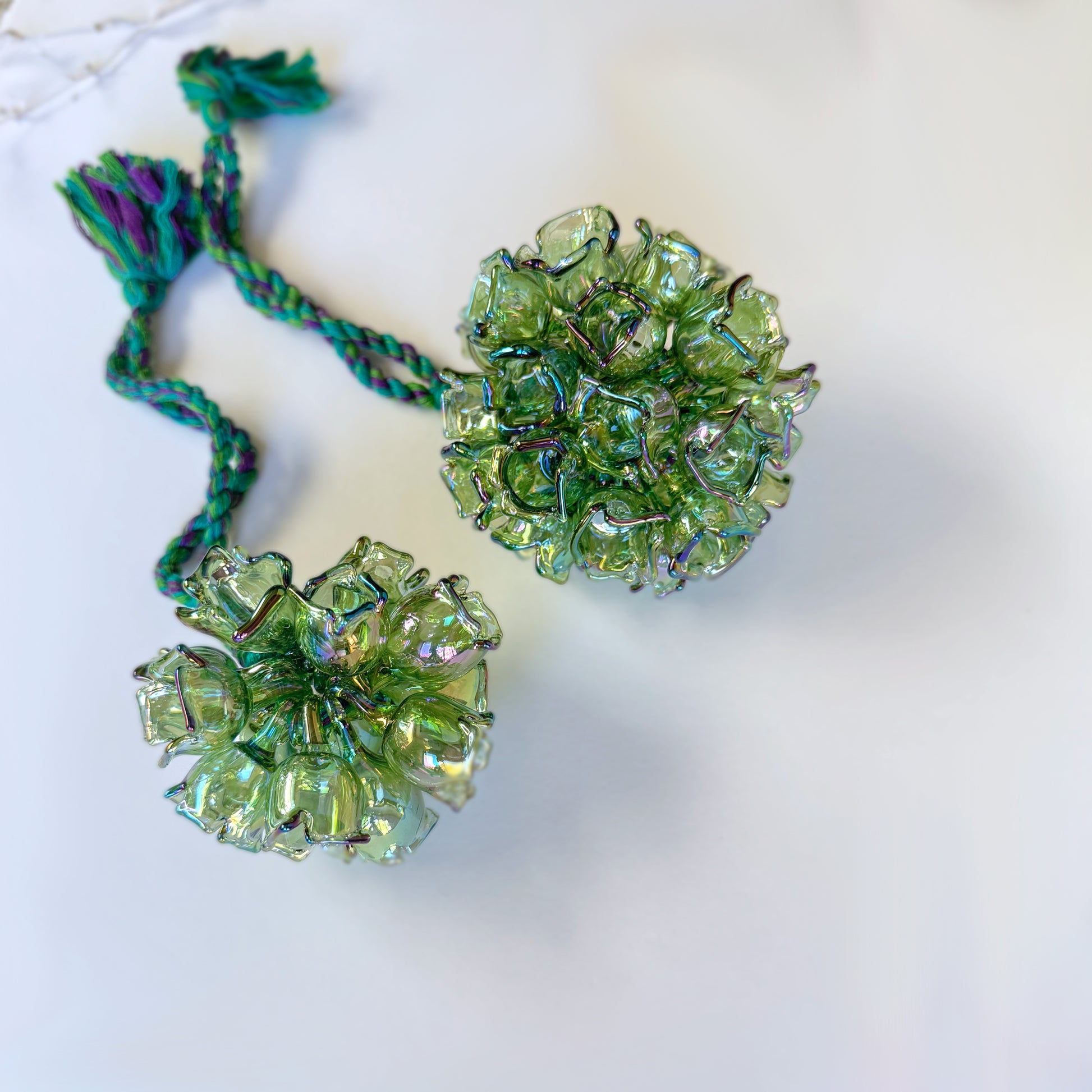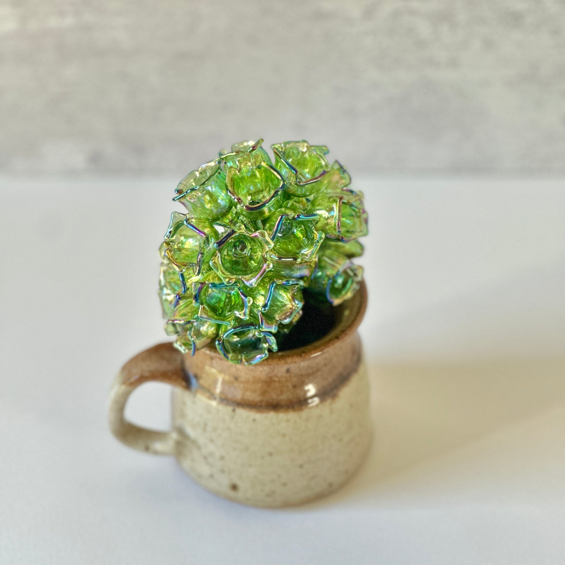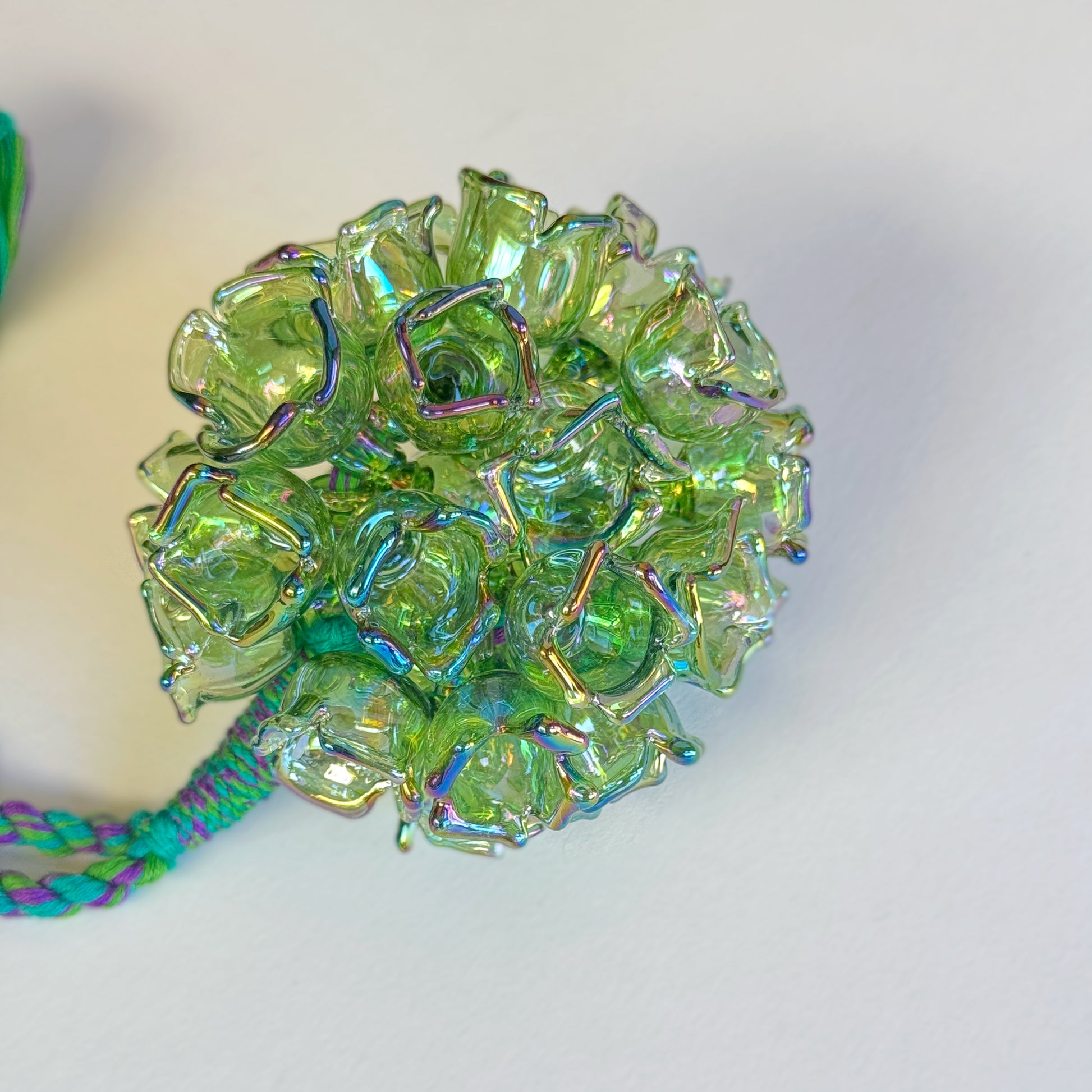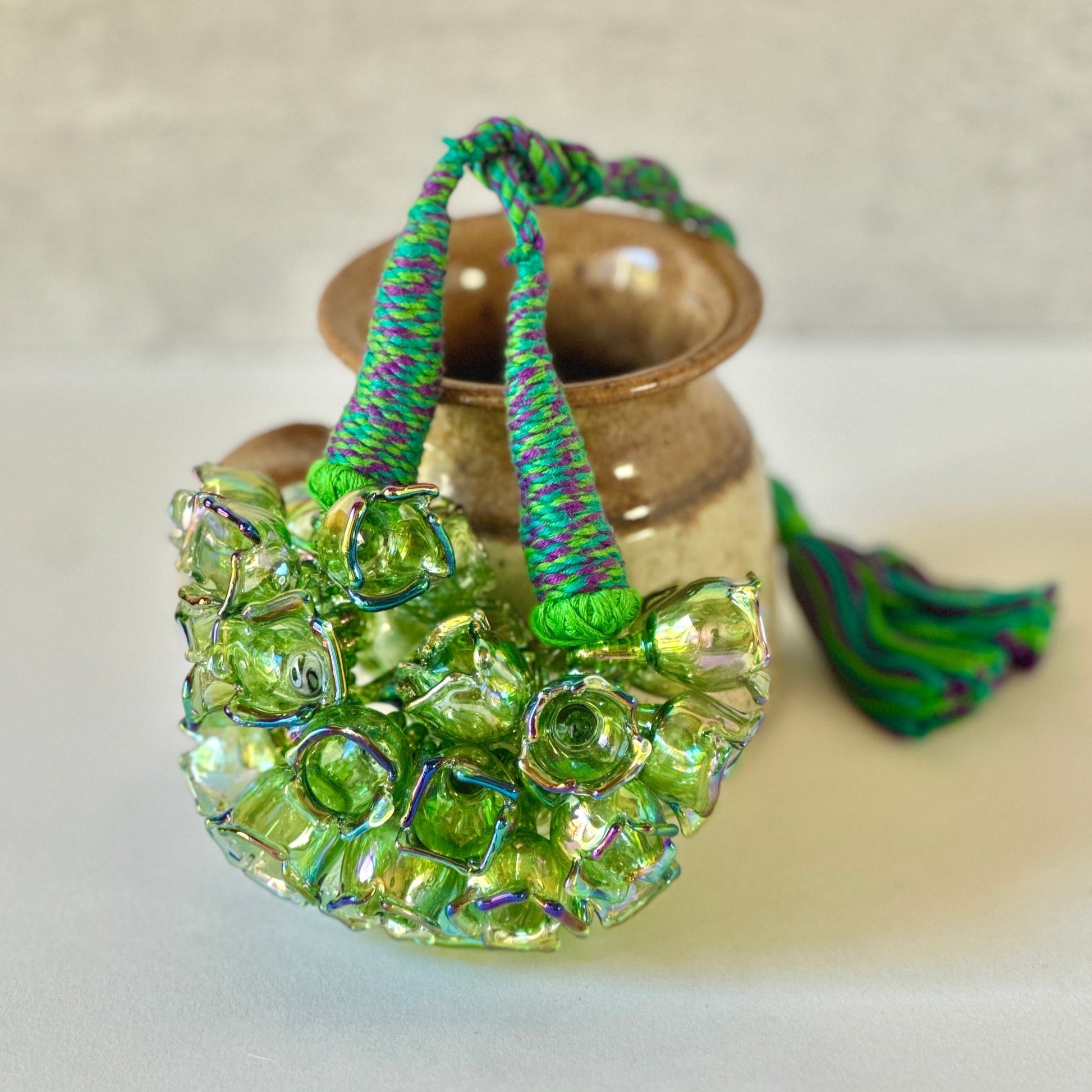 Brighten any corner of your interior spaces with our hand blown glass iridescent floral GLIMMER bouquets! Hand knotted in coordinated colors by traditional Patwa thread artisans in rural Rajasthan in a way where these can also be hung from a wall or ceiling. These catch lightly beautifully creating a joyful accent in any corner or desk surface of your home or office.