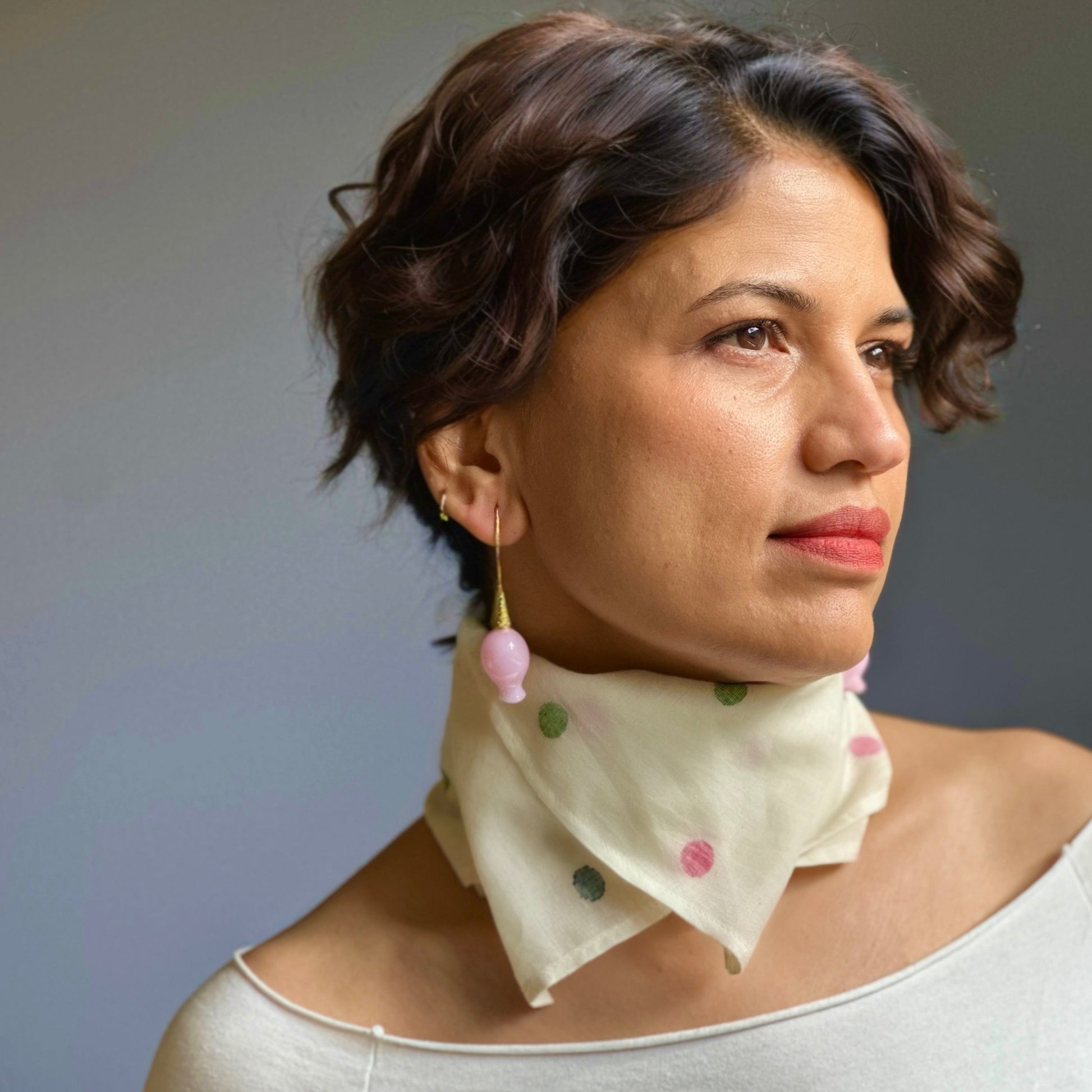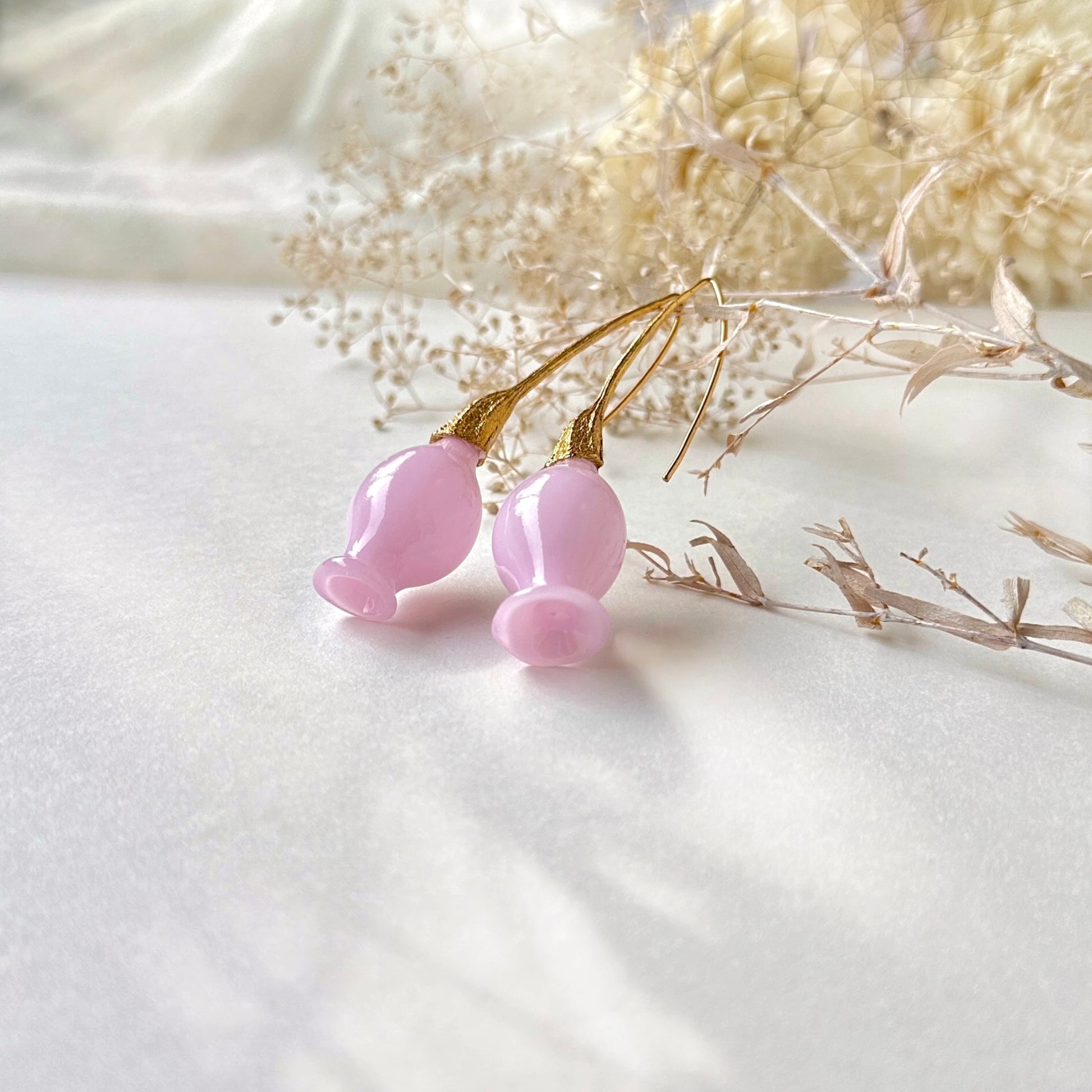 These earrings feature pink hand blown glass elements made by artisans from Firozabad, India. The small town of Firozabad has been a center of hand blown glass works historically. All our glass components are made of highest quality borosilicate. The craft of mouth-blowing glass requires exceptional skill, coordination, hand movement and intuition.