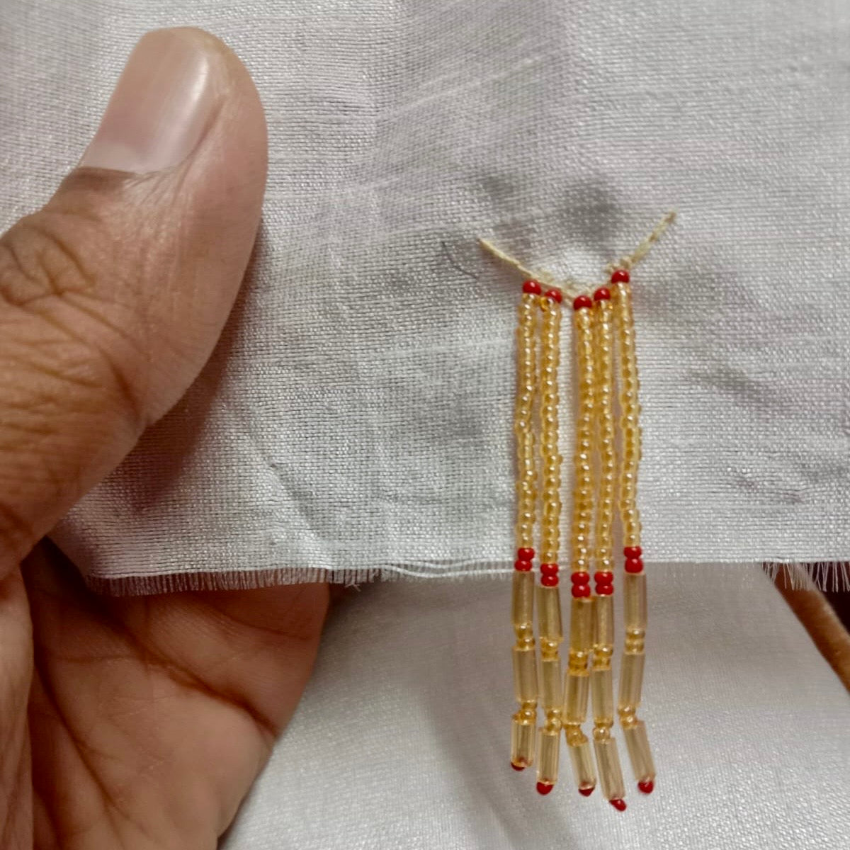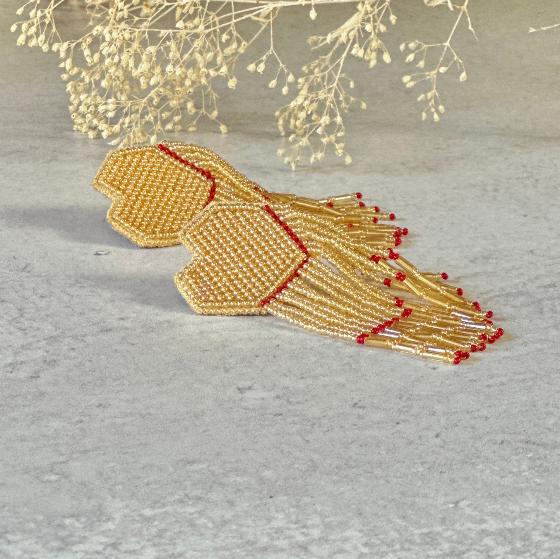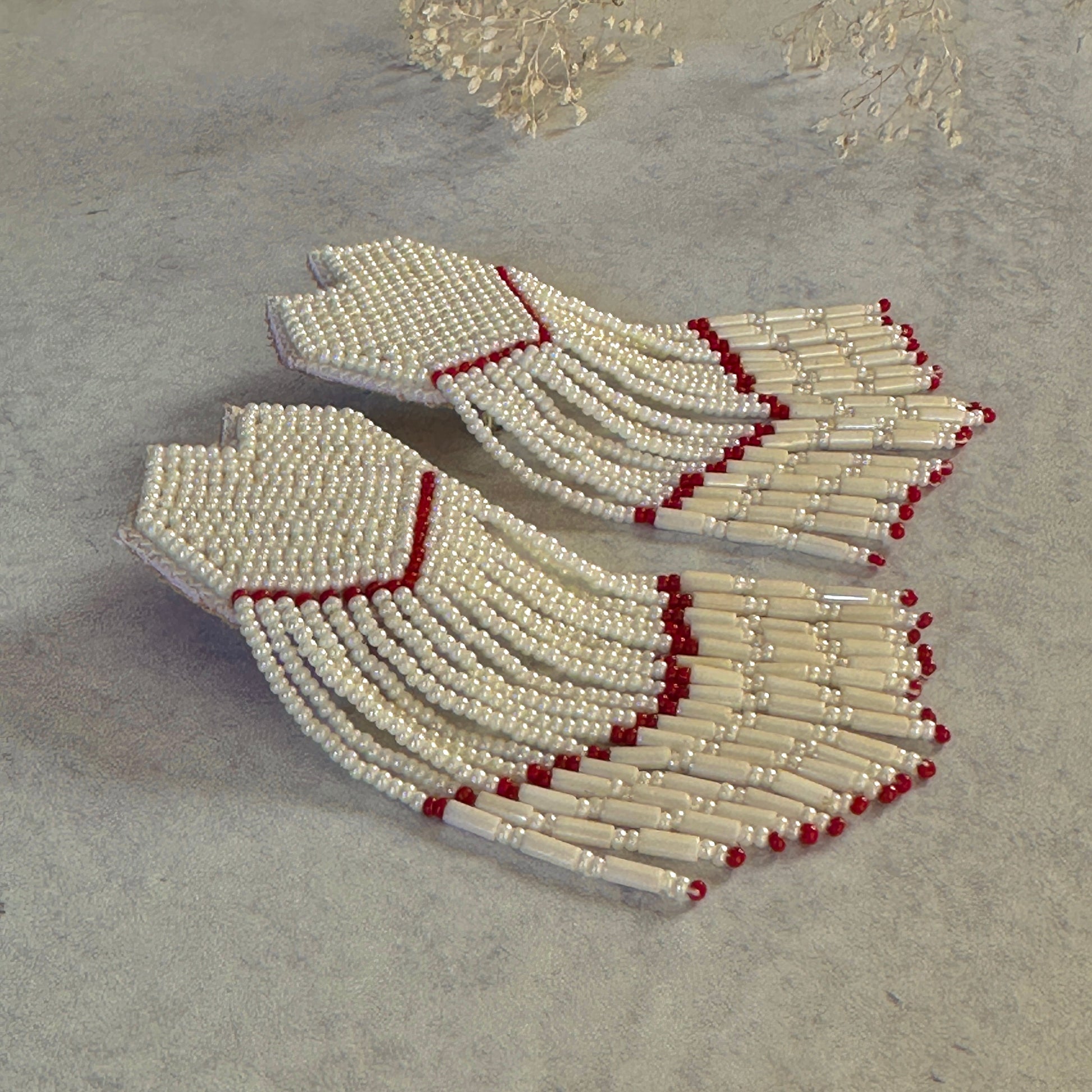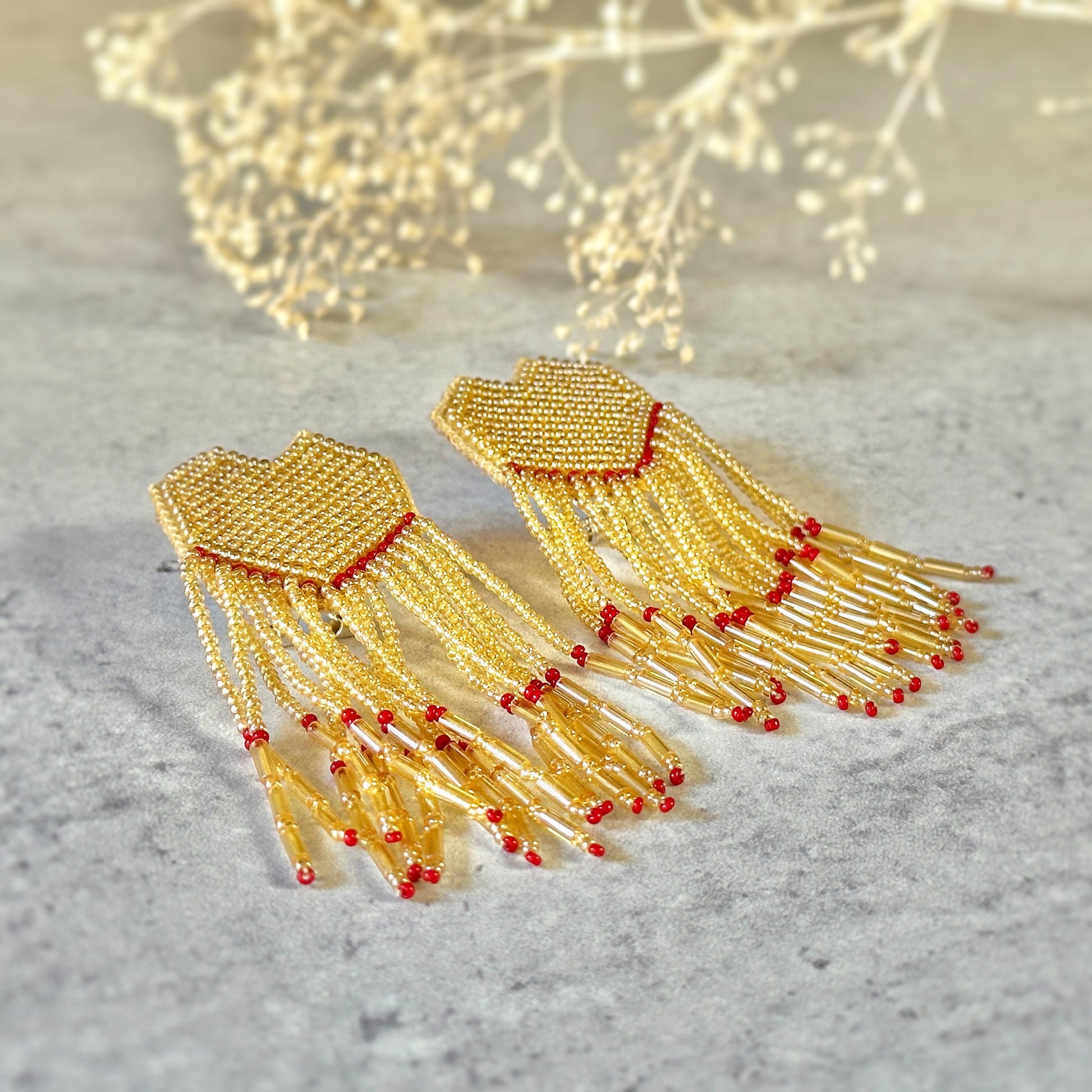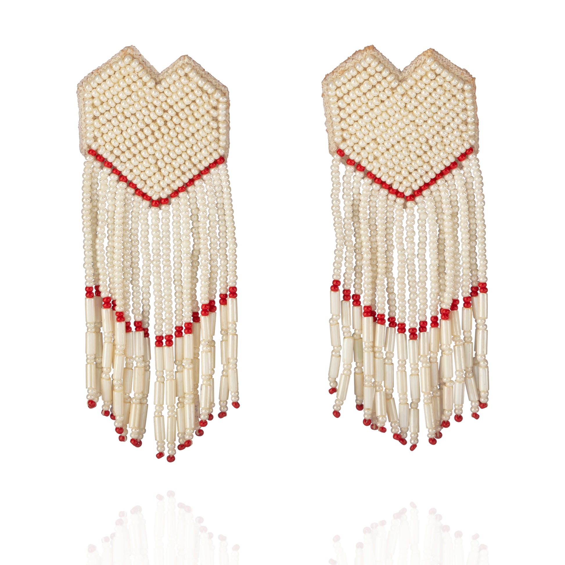 Introducing HEARTSTRINGS earrings, expertly hand embroidered with tiny pearl finish glass beads in gold and white variations with red as accent. This design is all about texture, pattern and dance of light and movement ✨✨ Elegant, artisanal and self evidently lightweight. What’s not to love! Made using hand embroidery technique on cotton base and velvet backing. Designed in US and ethically handmade by artisans in India.