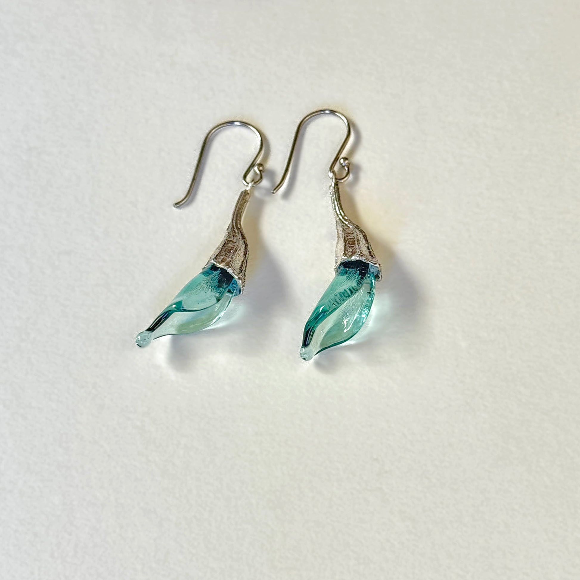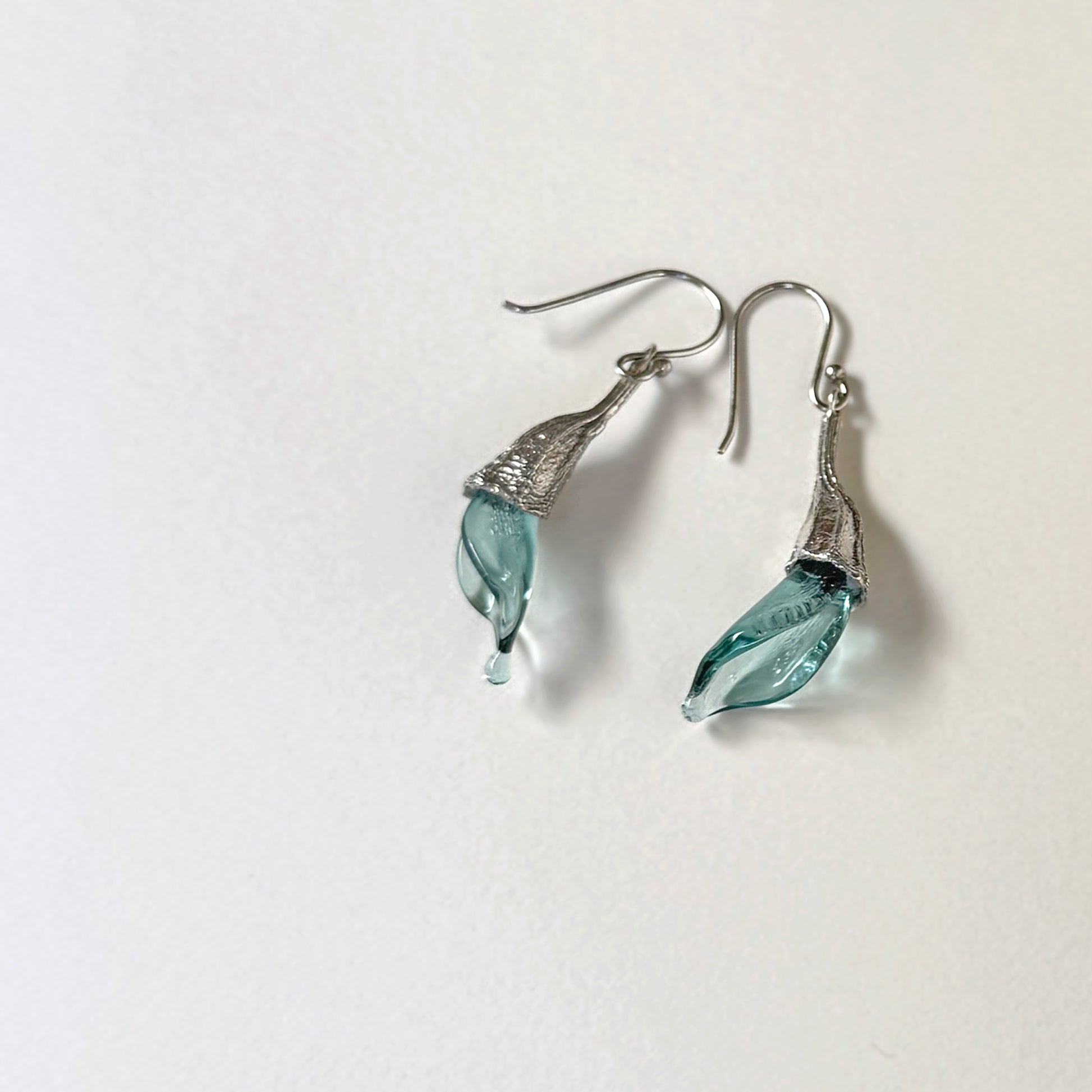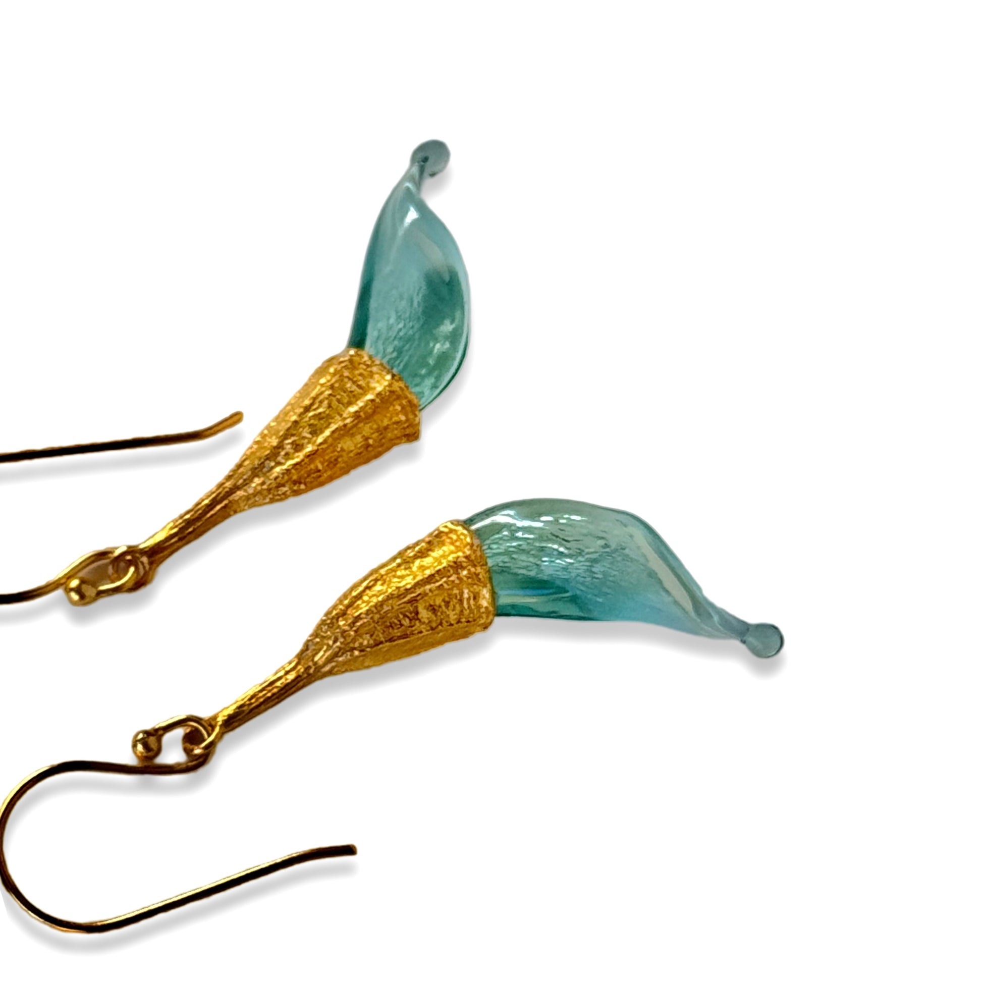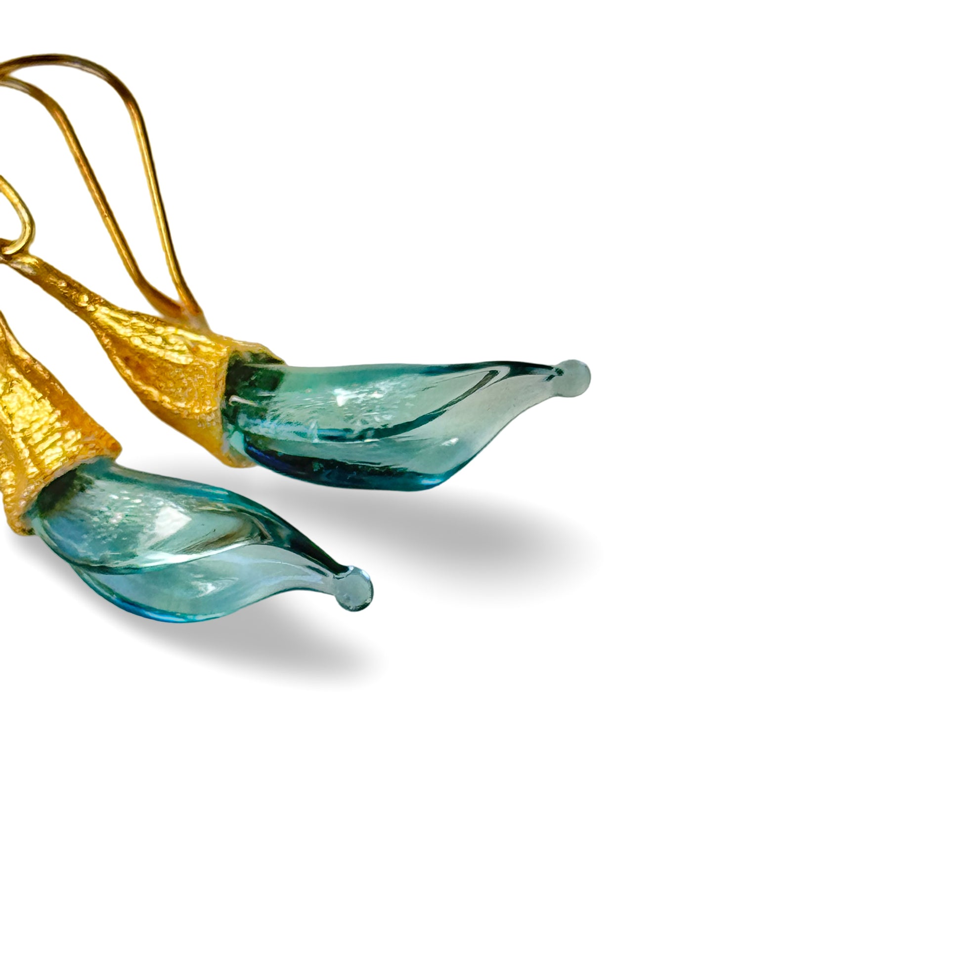 These earrings feature blue twisted glass petals expertly hand blown by artisans from Firozabad, India and designed by our founder here in California. The small town of Firozabad has been a center of hand blown glass works historically. All our glass components are made of highest quality borosilicate. The craft of mouth-blowing glass requires exceptional skill, coordination, hand movement and intuition.