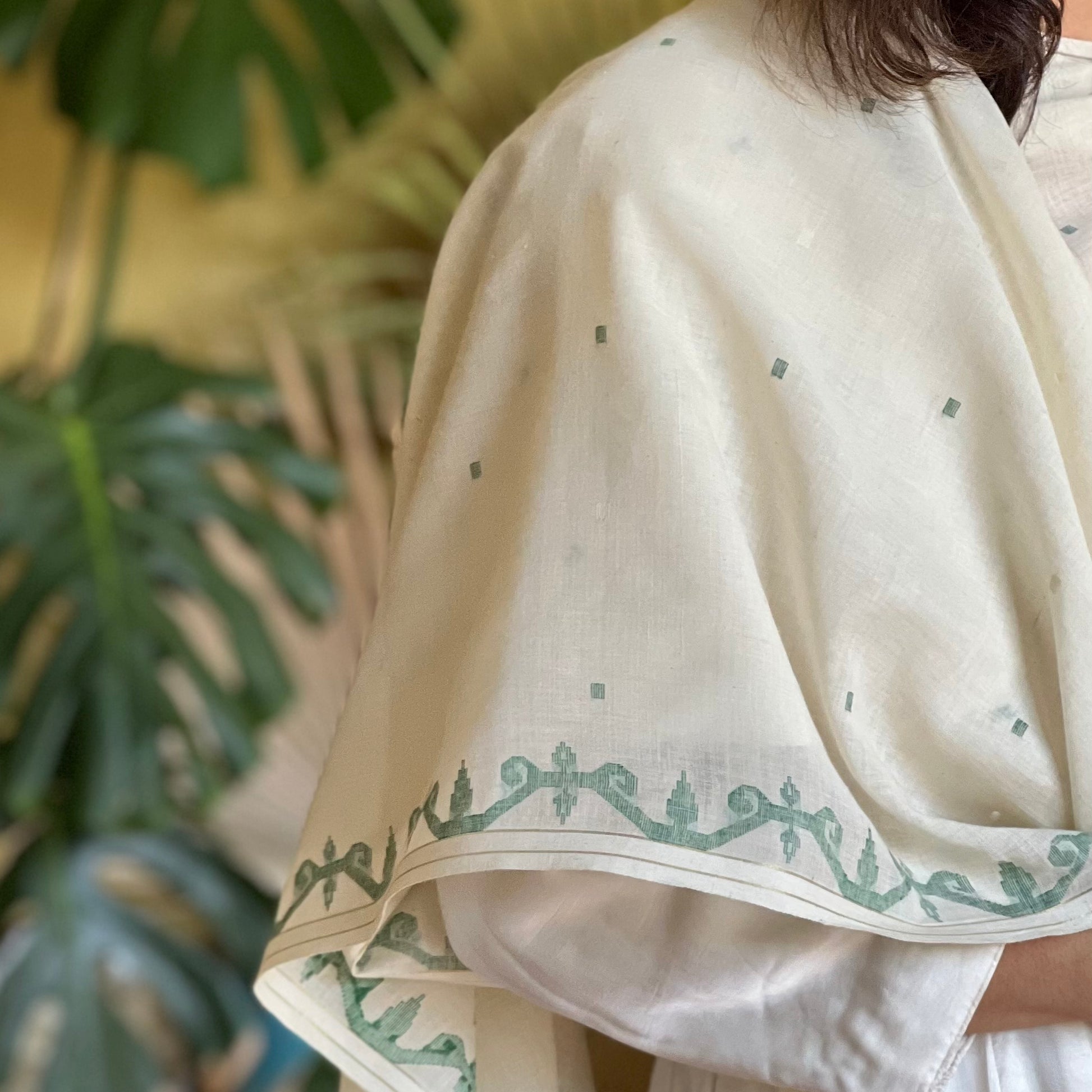 Light as air with superior sensory comfort, you will love our Liana Jamdani handwoven shoulder wrap. Featuring woven motifs that remind you of fresh twining vines, adding to its allure with its lightweight and silky feel that Bengal muslin is famous for.