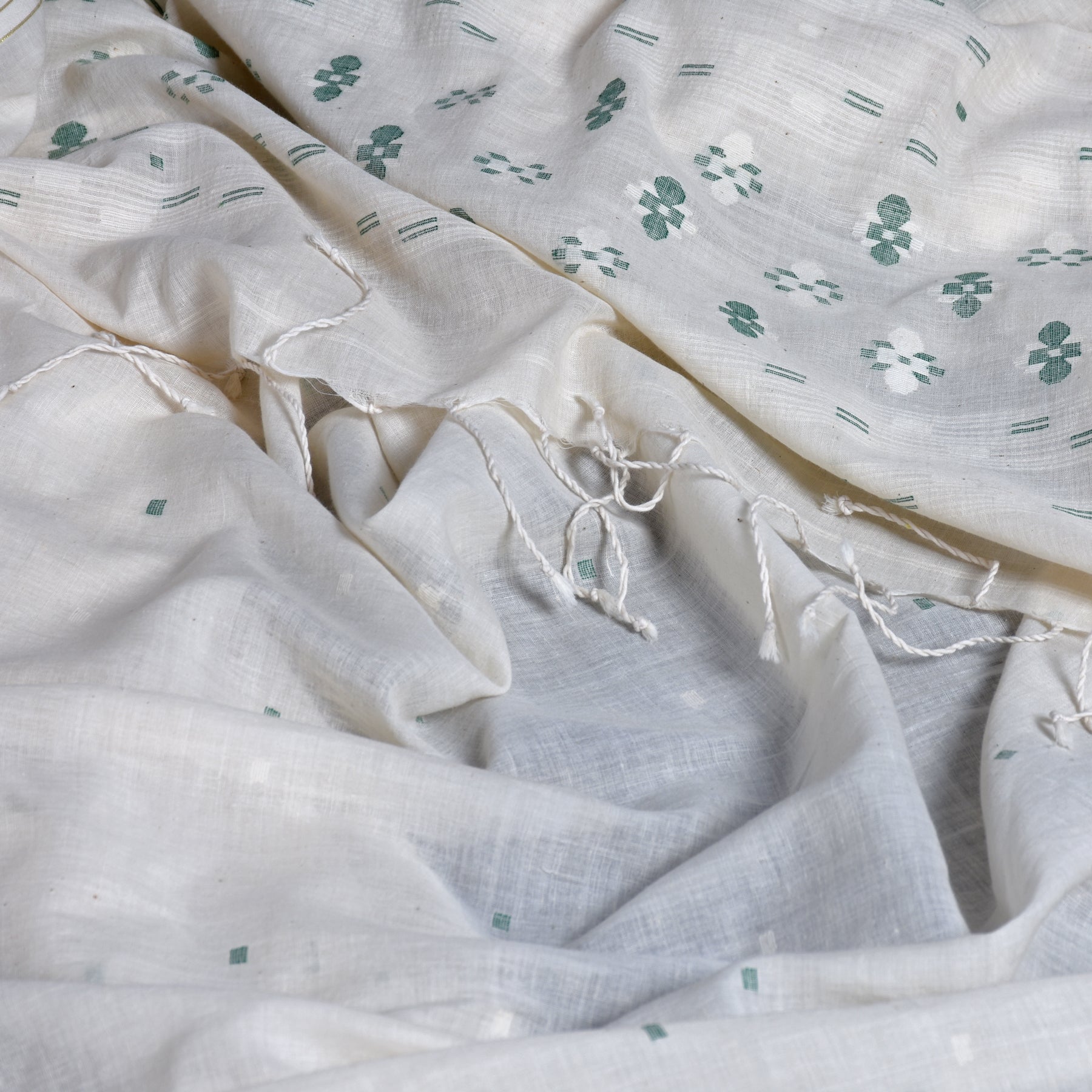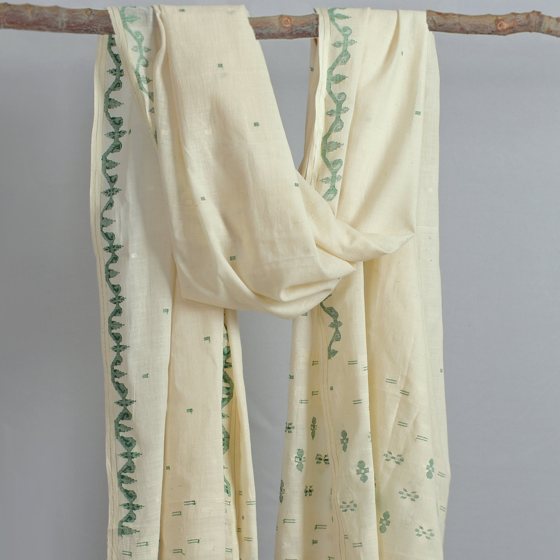 The base of the fabric is handspun and handwoven with high 150 count undyed, unbleached cotton, while the green supplementary motifs are dyed with azo-free dyes. Crafted using the traditional Jamdani weaving technique on a loom. The border is accentuated with a beautiful gold tissue zari stripes on the selvedge.