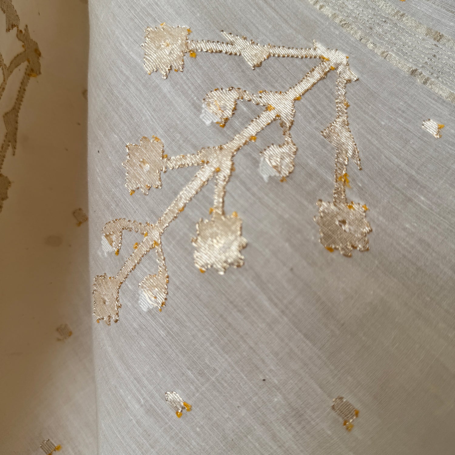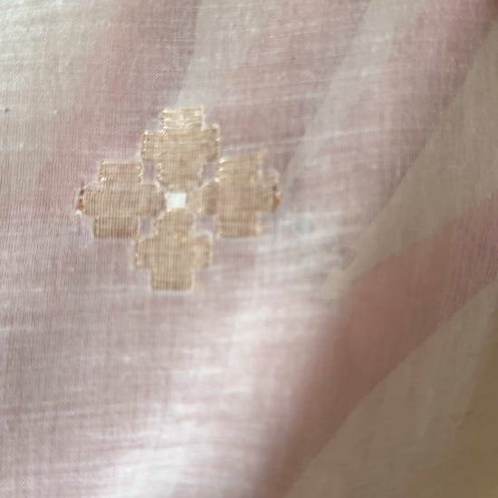 A contemporary take on the heritage Jamdani weave of West Bengal ( a UNESCO intangible heritage) in this remarkable design. Jamdani is a supplementary extra weft hand weaving technique akin to on loom needle embroidery. Thicker yarns are used to create motifs over finer base yarns, creating a beautiful interplay of light and transparency.