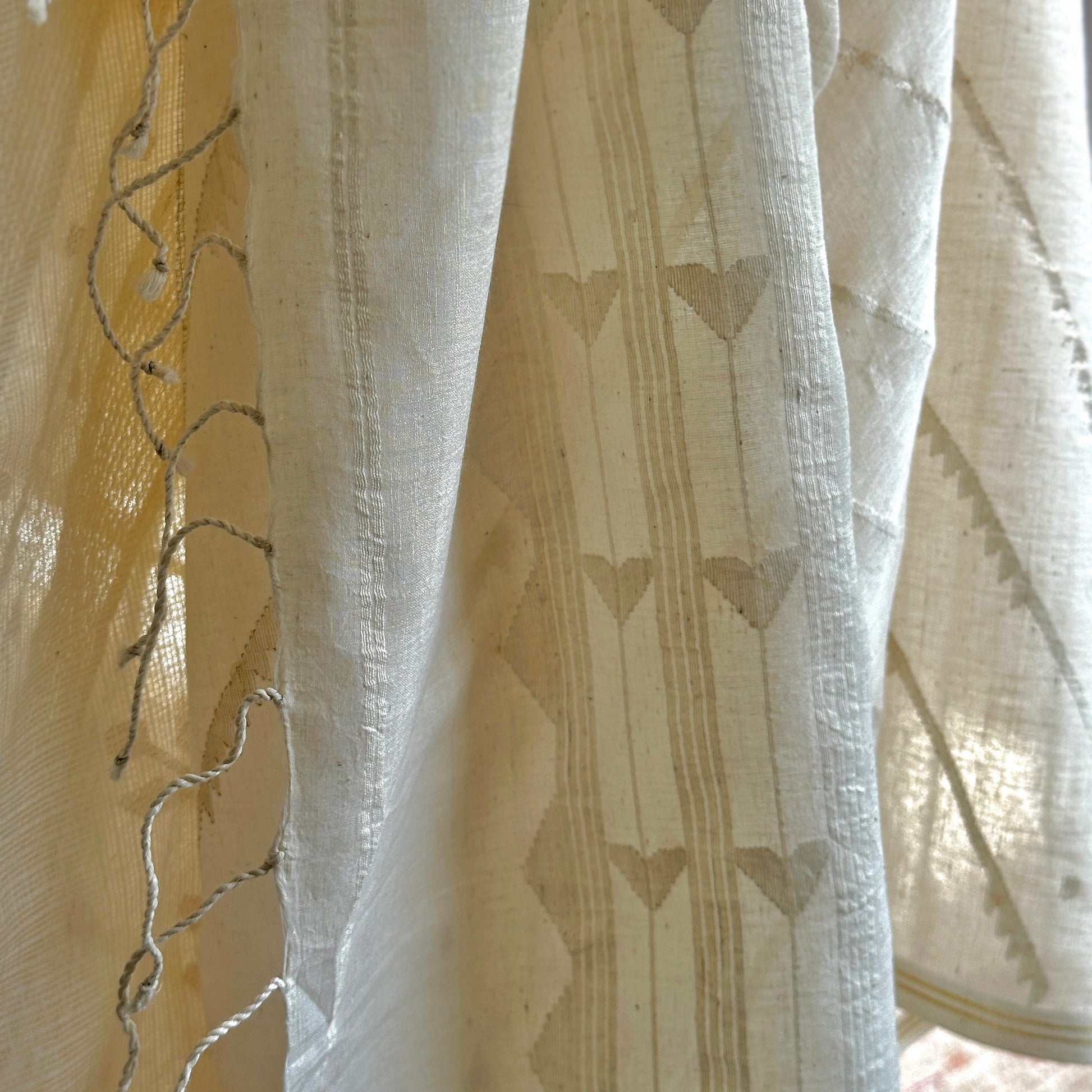 Experience the glory and sensory delight of famed high count needlework Jamdani textile, with this meticulously handcrafted shoulder wrap! Made of hand spun 150 count yarns and 100 count millspun undyed and unbleached cotton yarns.