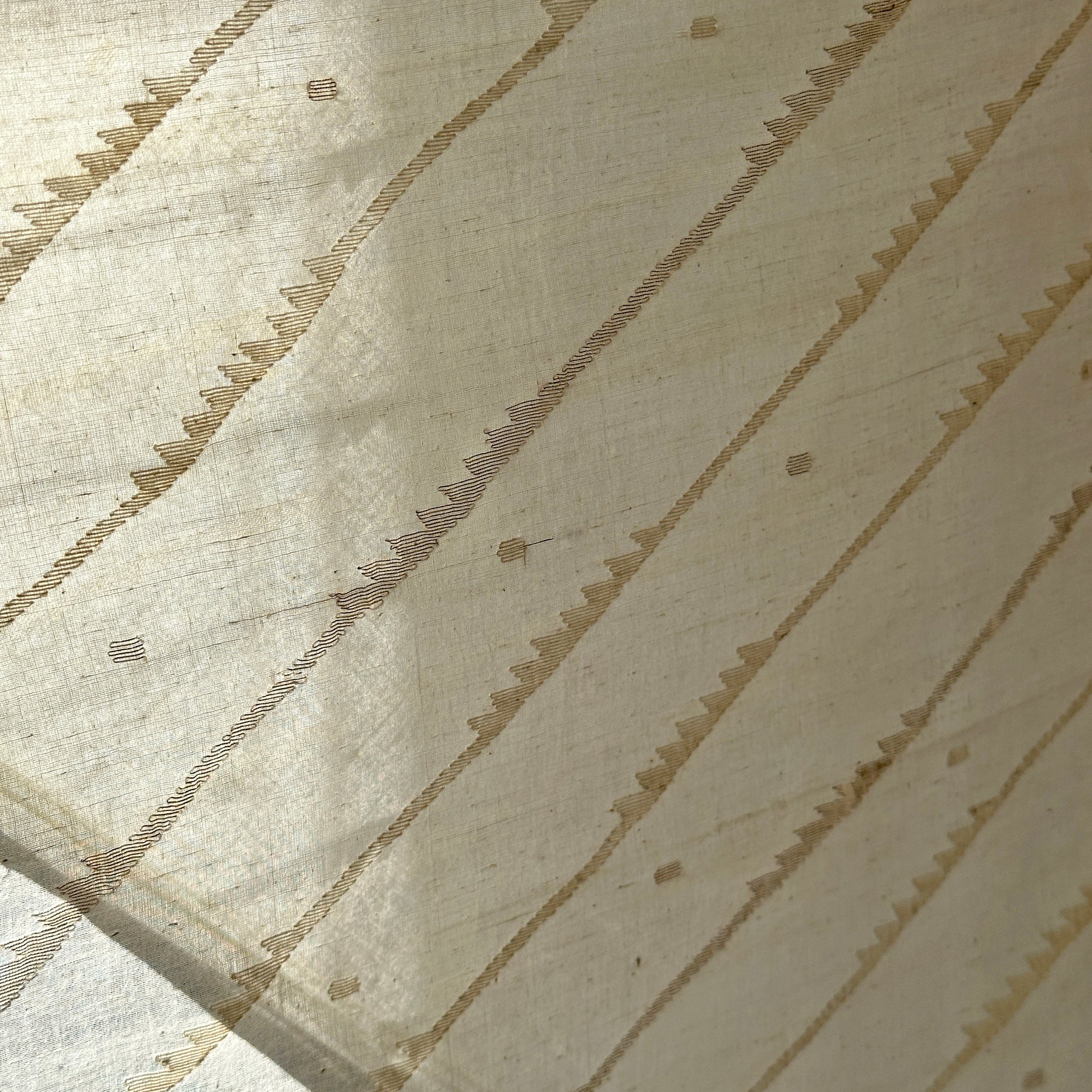 A contemporary take on the heritage Jamdani weave of West Bengal in this striking diagonal stripes across the width of this scarf. Jamdani is a supplementary extra weft hand weaving technique akin to on loom needle embroidery. Thicker yarns are used to create motifs over finer base yarns, creating a beautiful interplay of light and transparency.