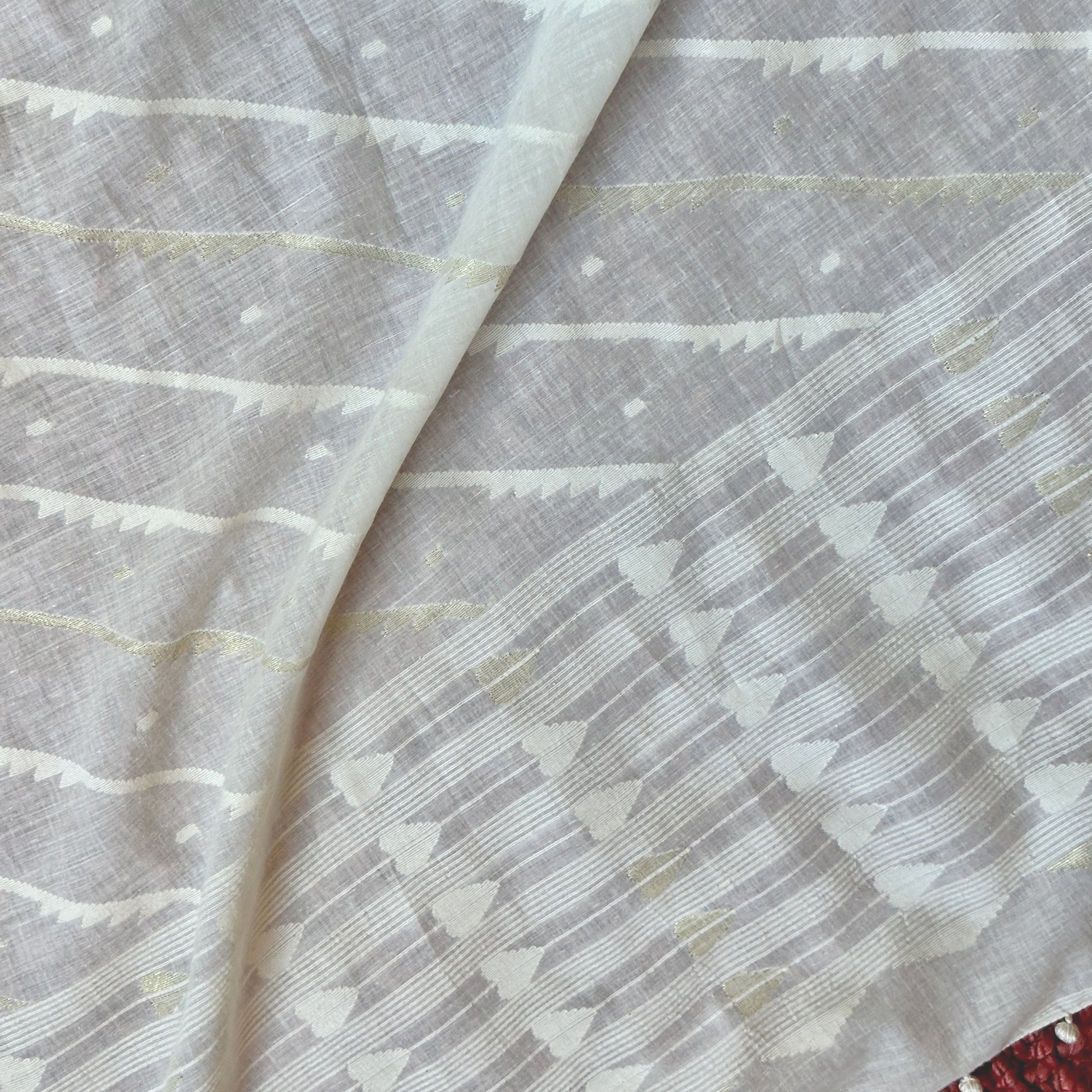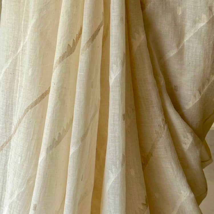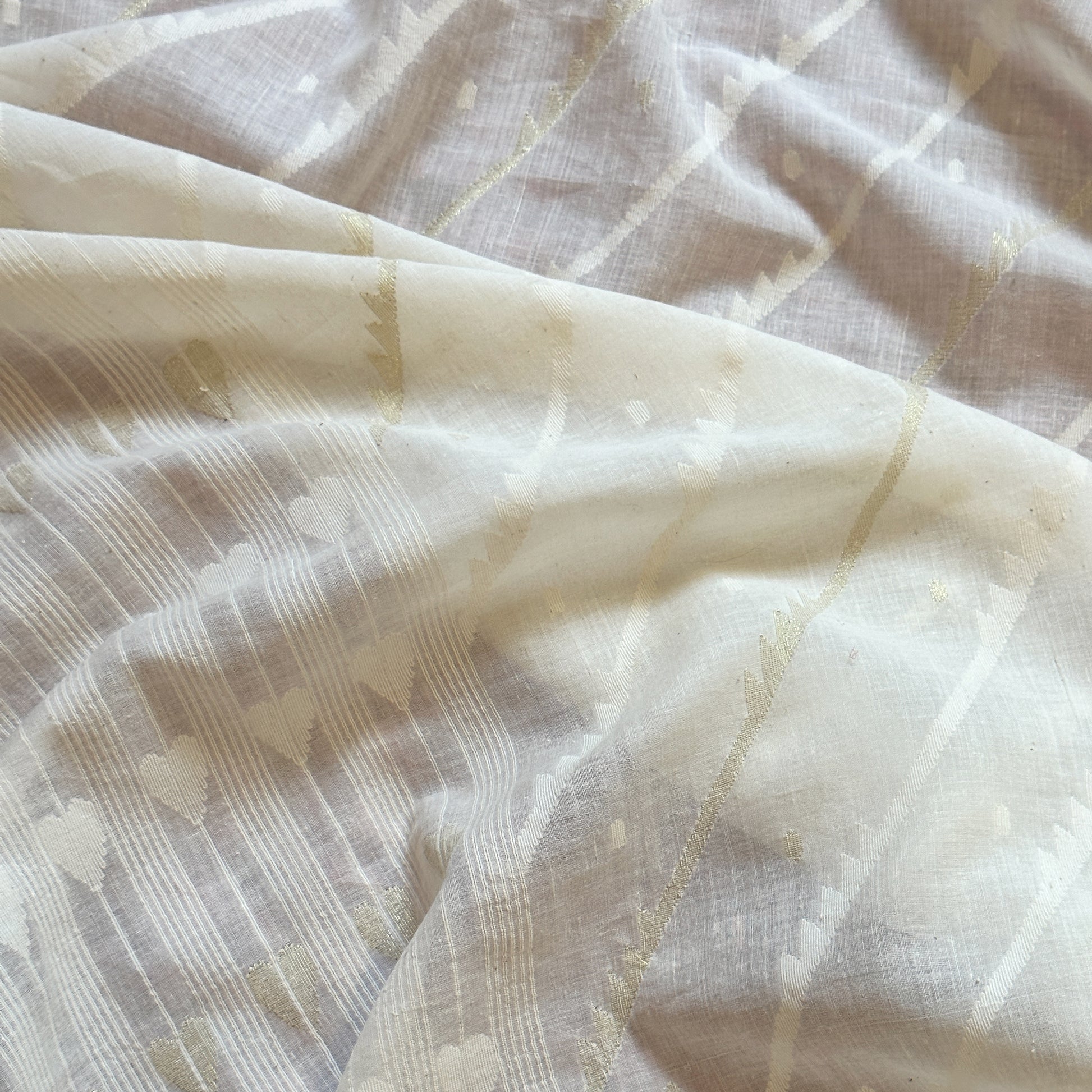 Experience the glory and sensory delight of famed high count needlework Jamdani textile, with this meticulously handcrafted Terchi Leheriya sari! Made of handspun 150 count yarns and 100 count millspun undyed and unbleached cotton yarns.