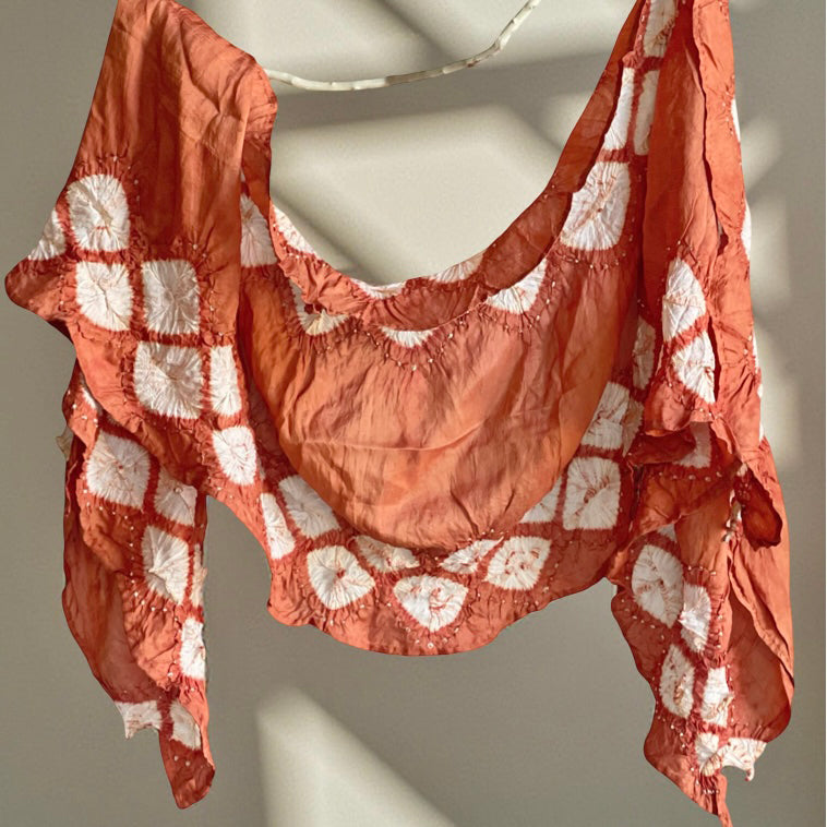 Feel the gentle softness and vibrant rusty red shades of our handwoven Mulberry silk scarf. Created with a modern twist on tie-dye using natural Sapanwood, this scarf is a joyful nod to creativity, culture, and craftsmanship. Made from the finest Malda indigenous mulberry silk from rural West bengal, its playful, sculptural form showcases the traditional Bandhni technique from Kutch region of India, in a fresh artistic flair! Please note the rust red color, which is lighter in some scarves than the others. If you have a preference please leave us a note.