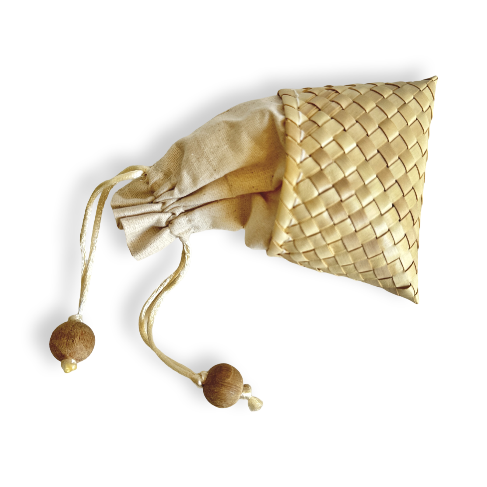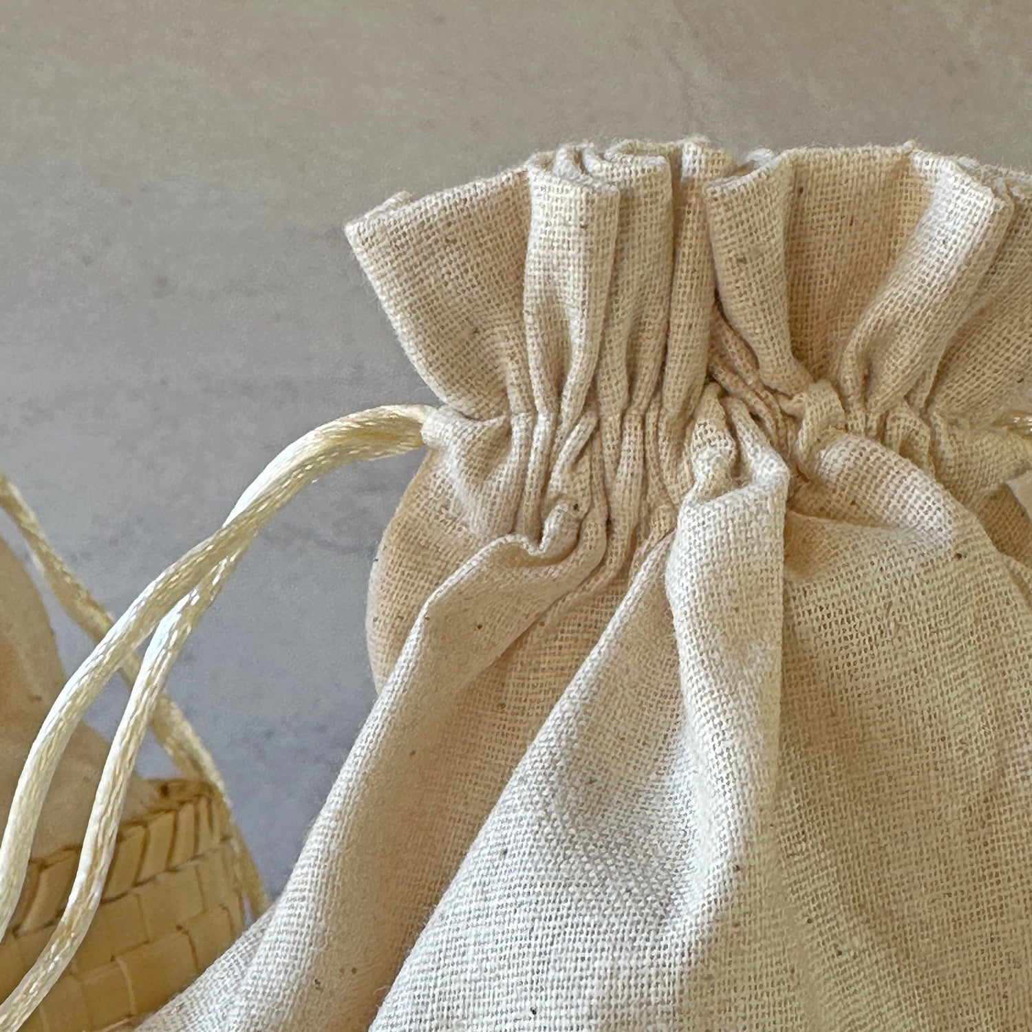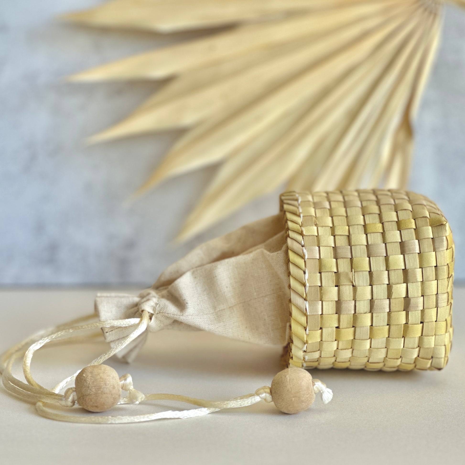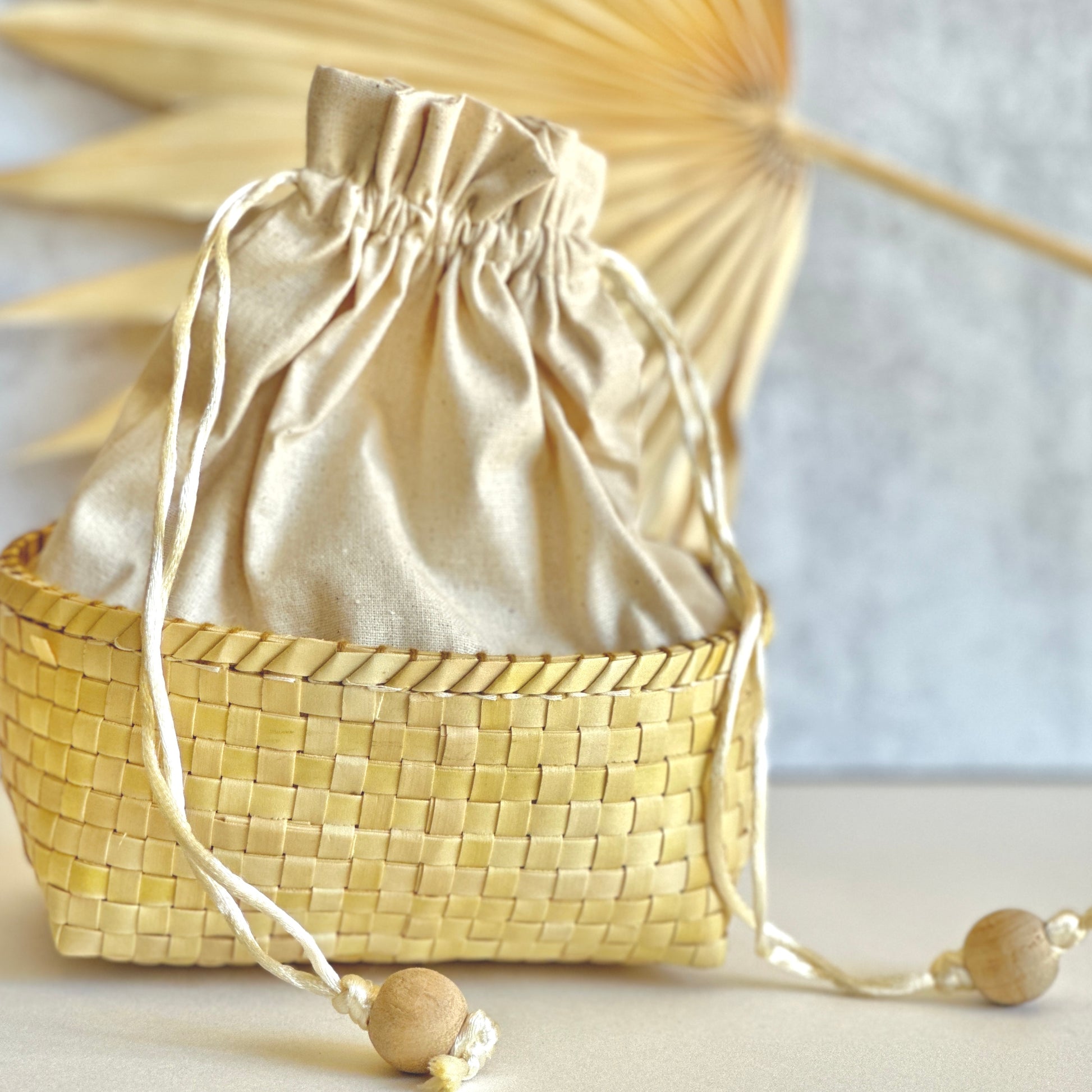 Perfect for your gift giving, gift wrapping and aesthetic organizing needs, our Kottan baskets are made using locally sourced natural color Palmyra leaves and undyed, unbleached natural cotton. These bags are completely fabric lined for easy safekeeping and storage. Cinched closure featuring natural wood beads on the cord.