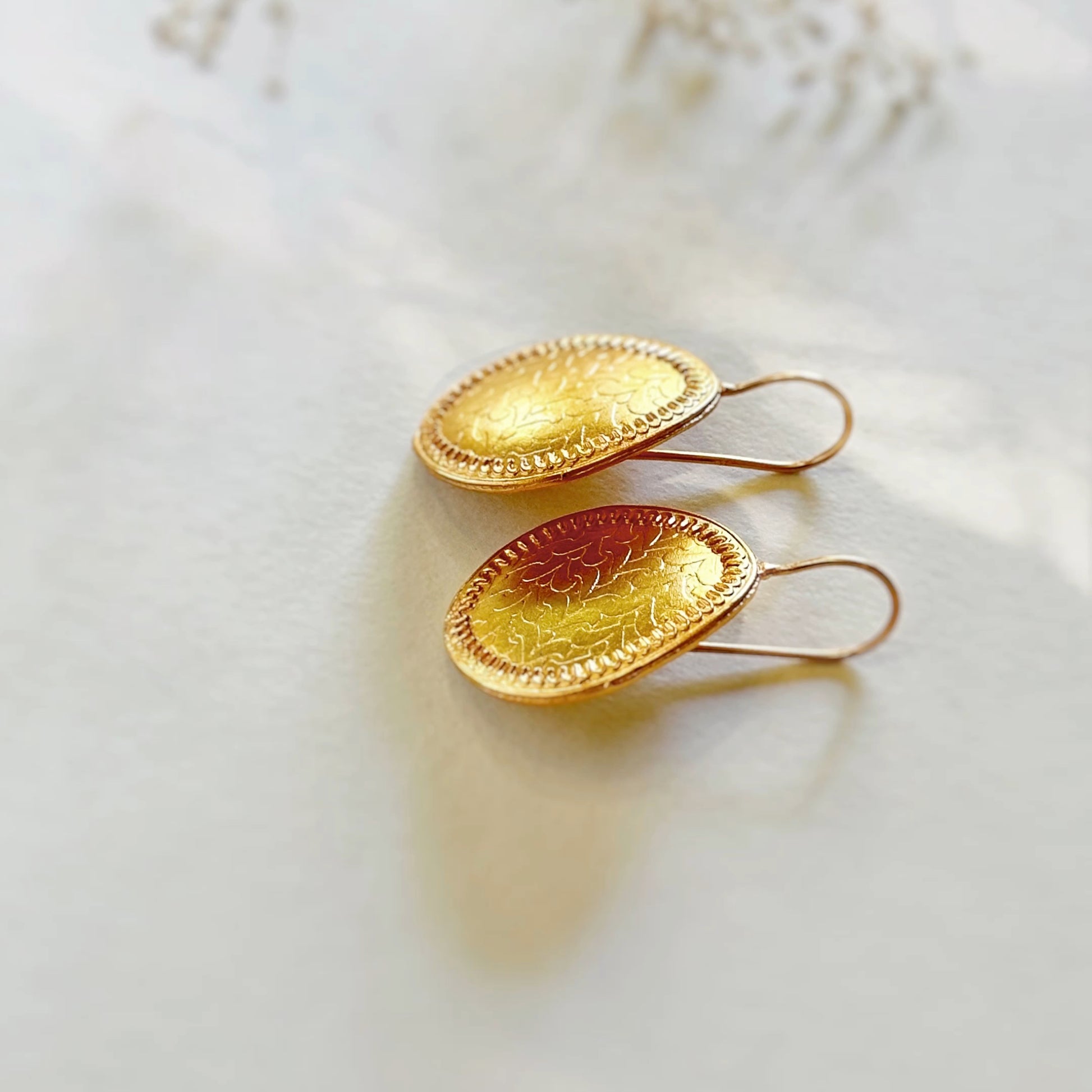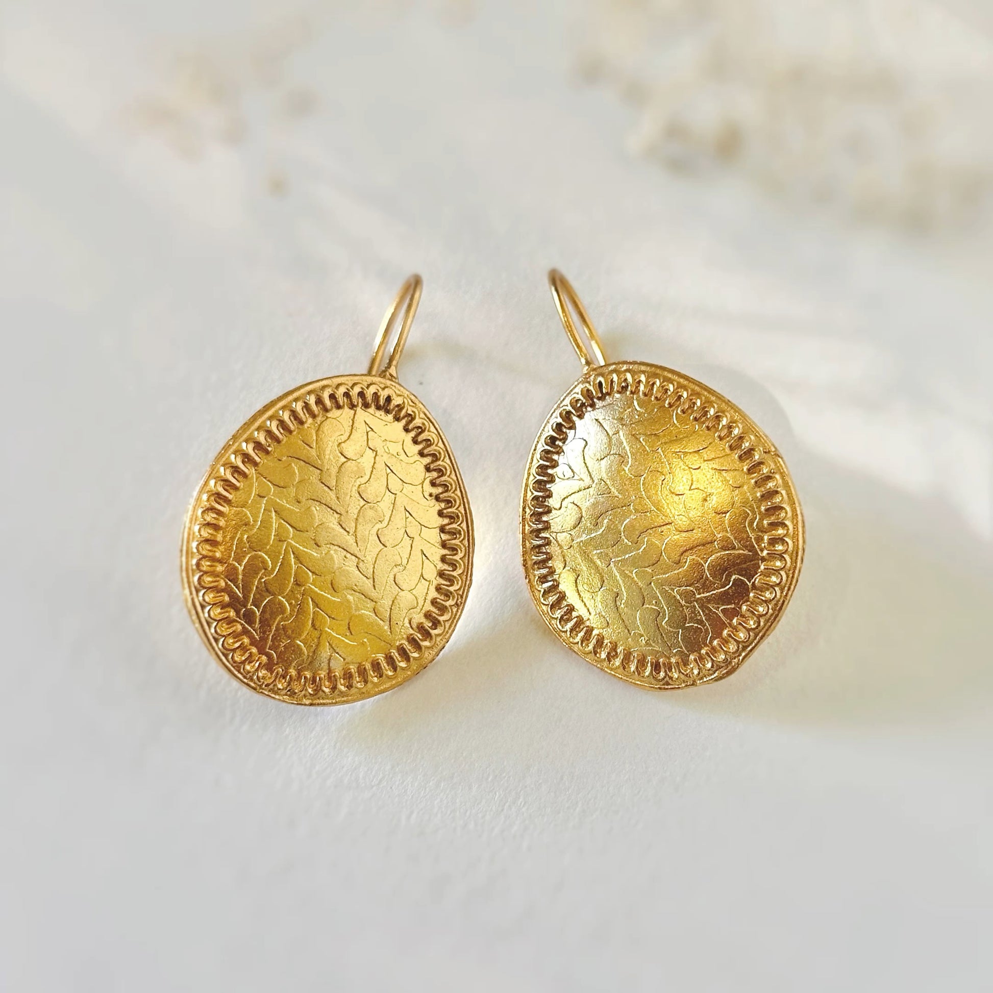 Psithurism Patti gold plated dangle earrings are beautifully detailed, with ornate border and leaflet like etched pattern. Psithurism is a Greek word for for the sound of rustling leaves. Fyoli Fyoli jewelry is about cultivating a deeper appreciation of the natural beauty that surrounds us. Original master was made by our Founder and then sent for ethical production to our Jaipur studio 🍃These earrings have a modern and at once a tribal feel to them which you'll love!