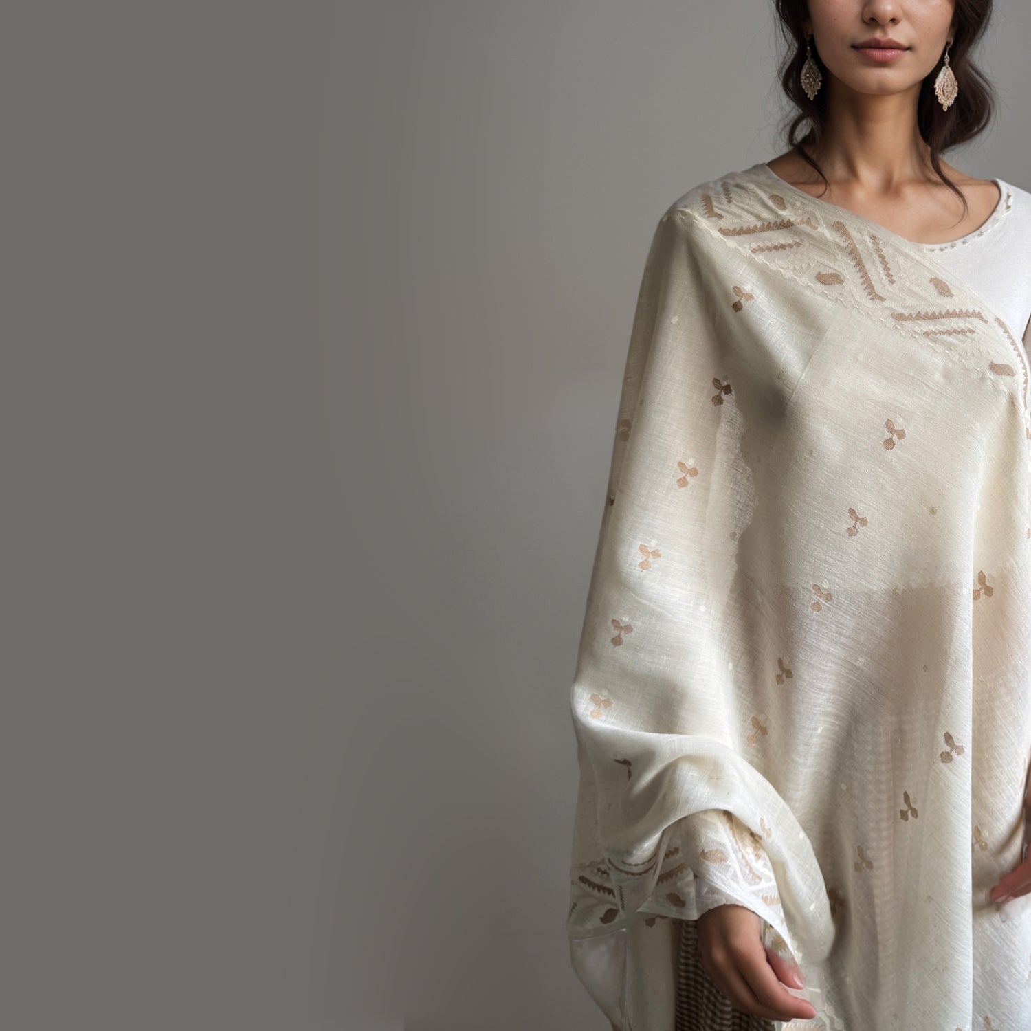 Soft, billowy, light as air, SIENNA needlework Jamdani wrap in 200 count cotton handspun cotton weft and 120 count millspun warp. This scarf is made using undyed, unbleached kora cotton and naturally brown organic cotton as accent.
