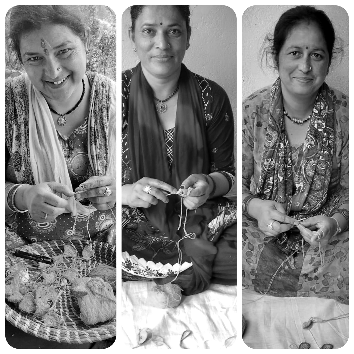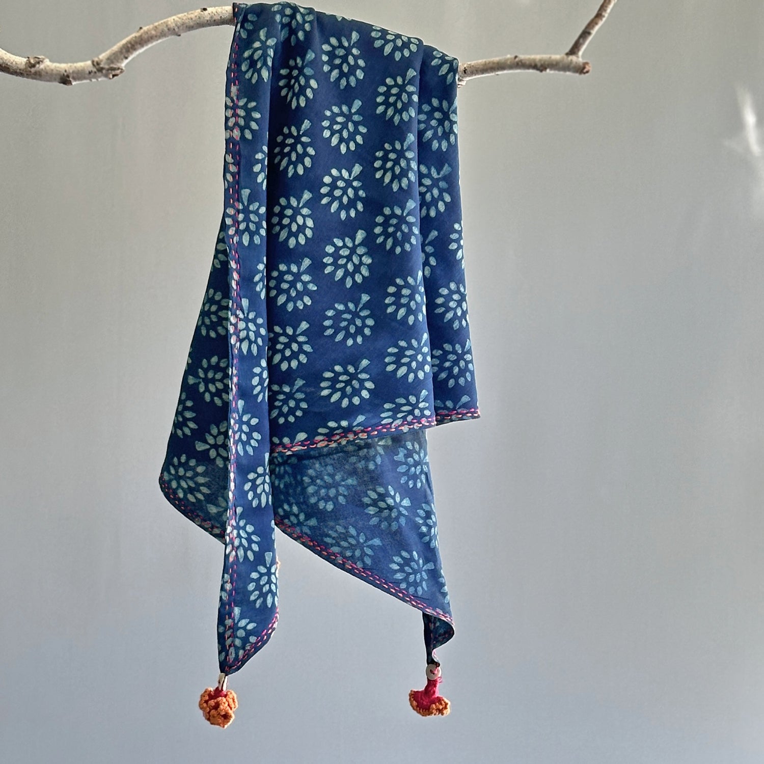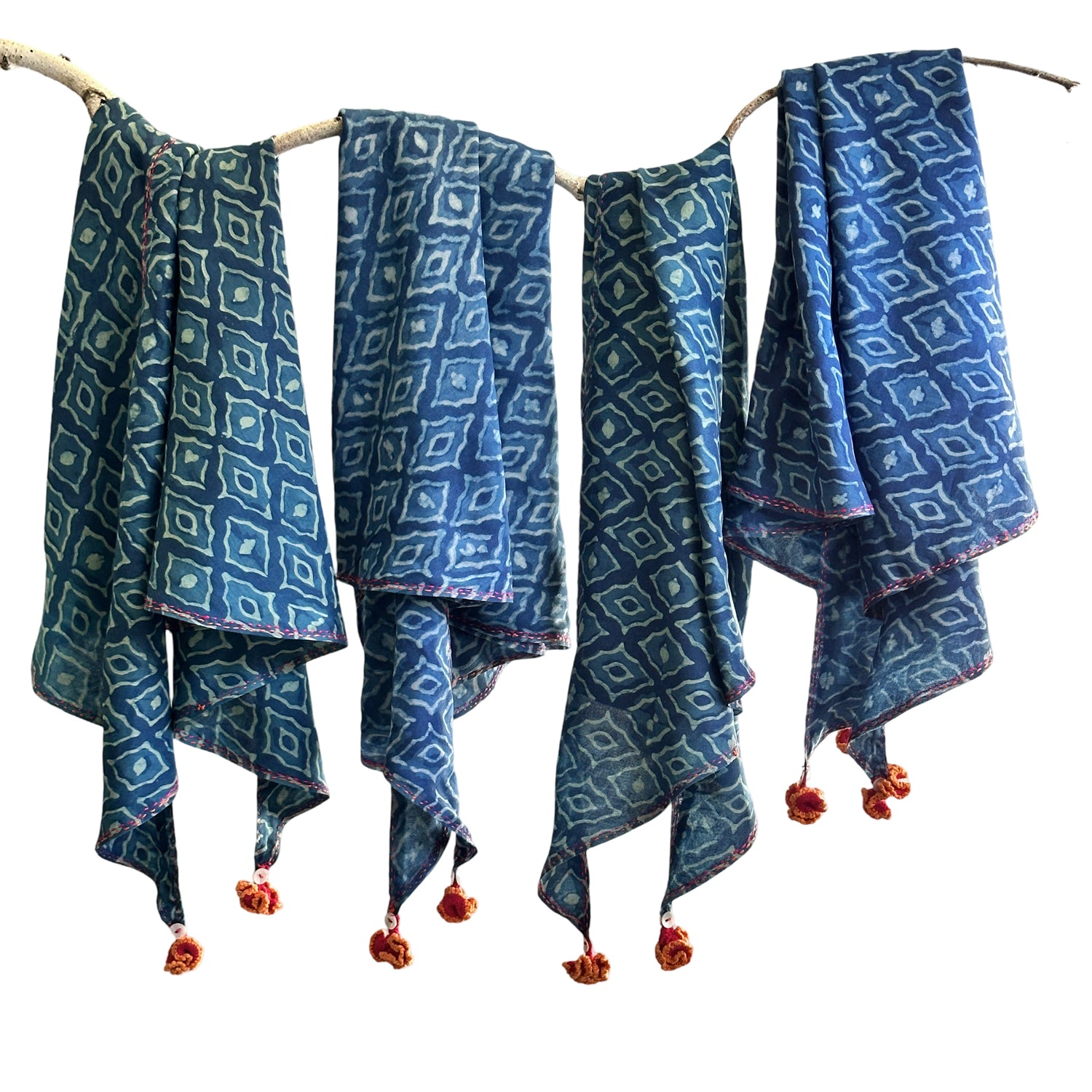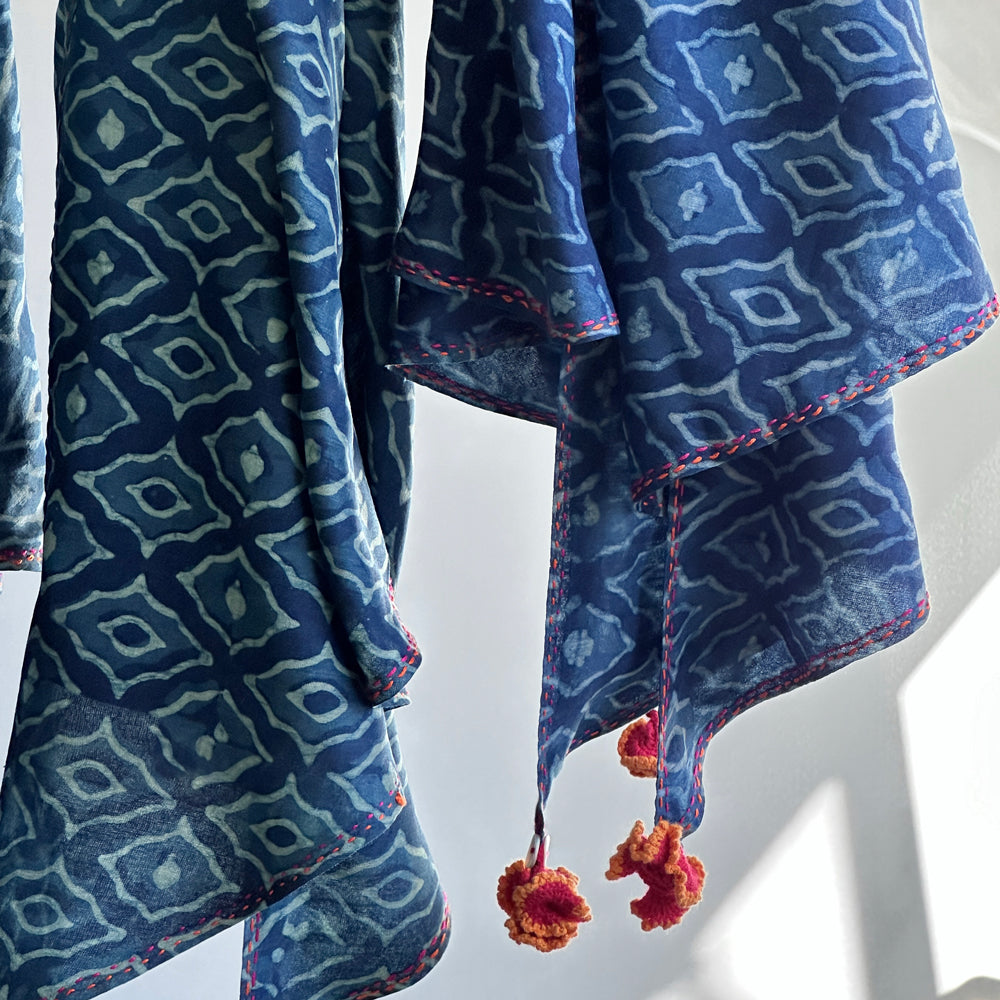 These have been hand block printed in multiple cycles of Indigo dye to achieve a range of blue shades, a highly skilled heritage craft from Akola village in Rajasthan. The fabric has been hand spun and woven in rural West Bengal, India. Hand detailing using techniques of embroidery and hand crocheting, Cute cotton floral tassels are made by women artisans of Khetihan village in the Himalayan foothills of Uttarakhand.