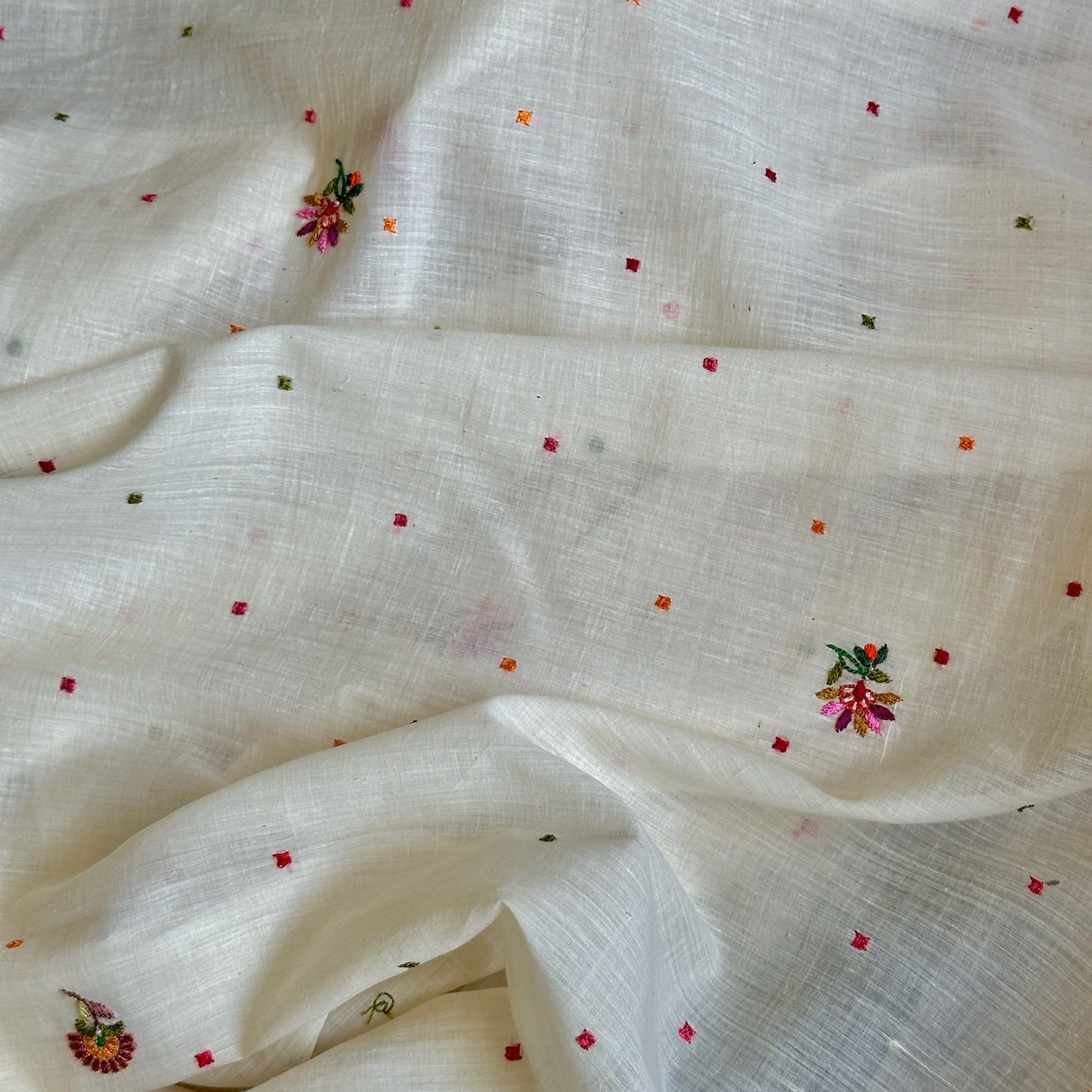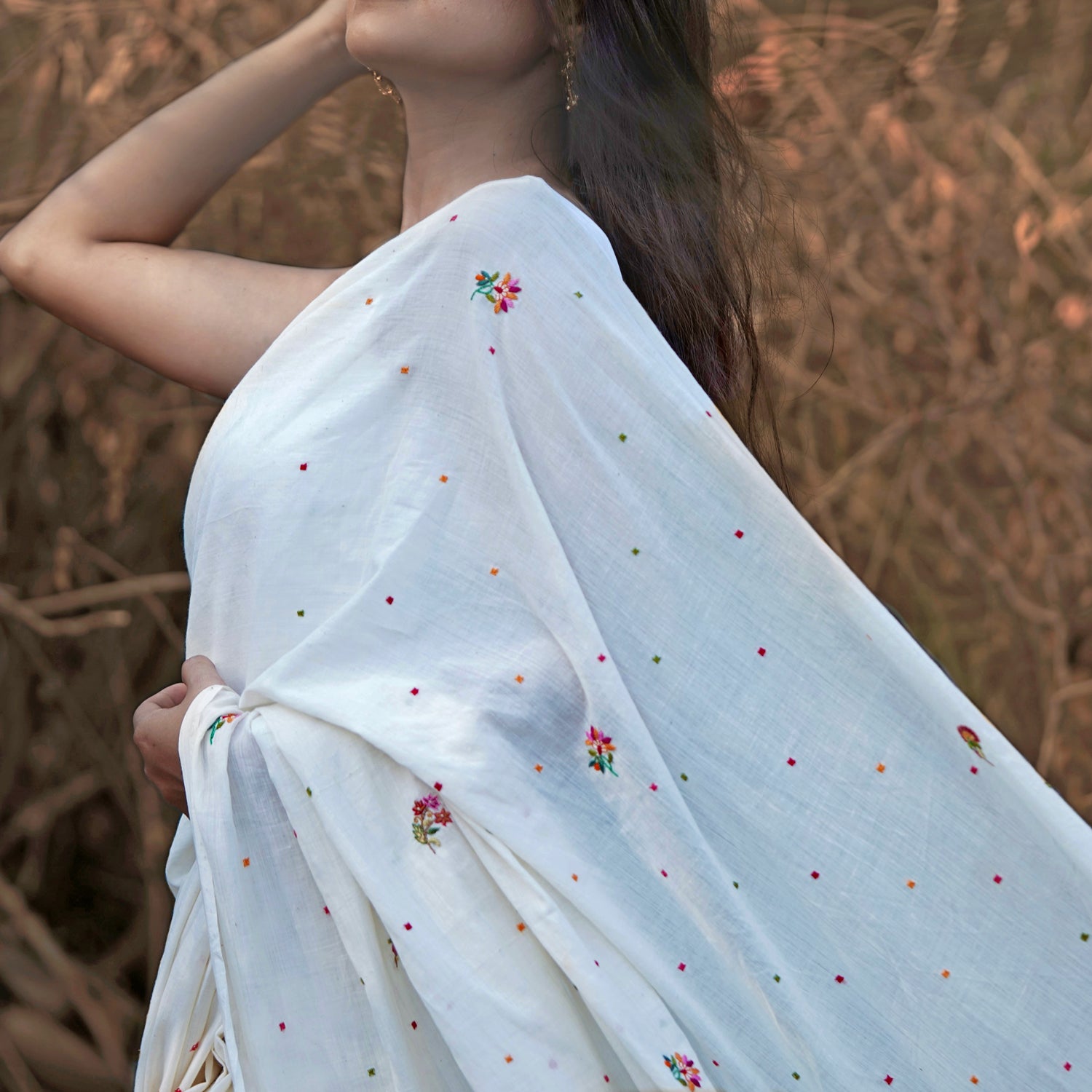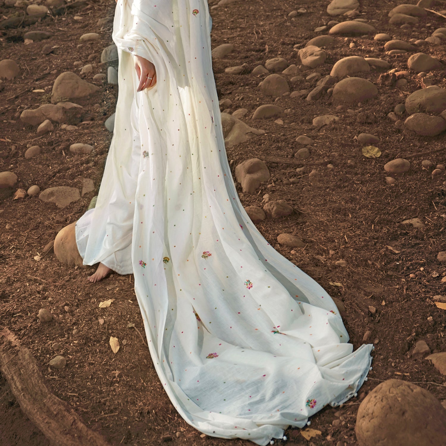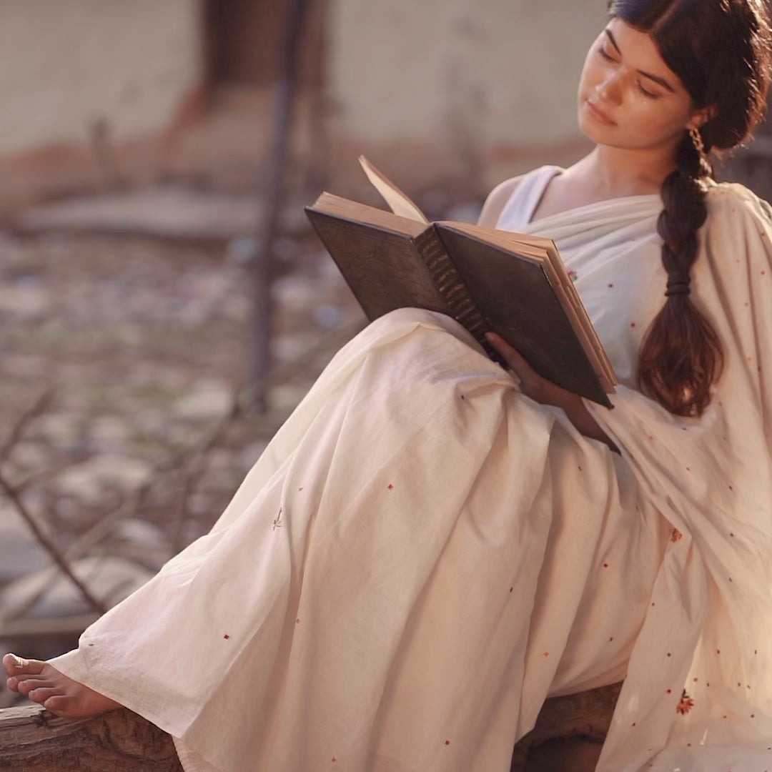 A perfect summer textile, this Vintage SPRING BLOSSOM sari is an enchanting blend of visual and sensory delight. Utter softness of 250 count hand spun, handwoven natural kora( undyed unbleached cotton) white fabric, the delicacy of the hand embroidery and the sweetness of the blossoms! It's a reminder to slow down, appreciate the simple joys of nature, and find solace in the beauty that surrounds us.