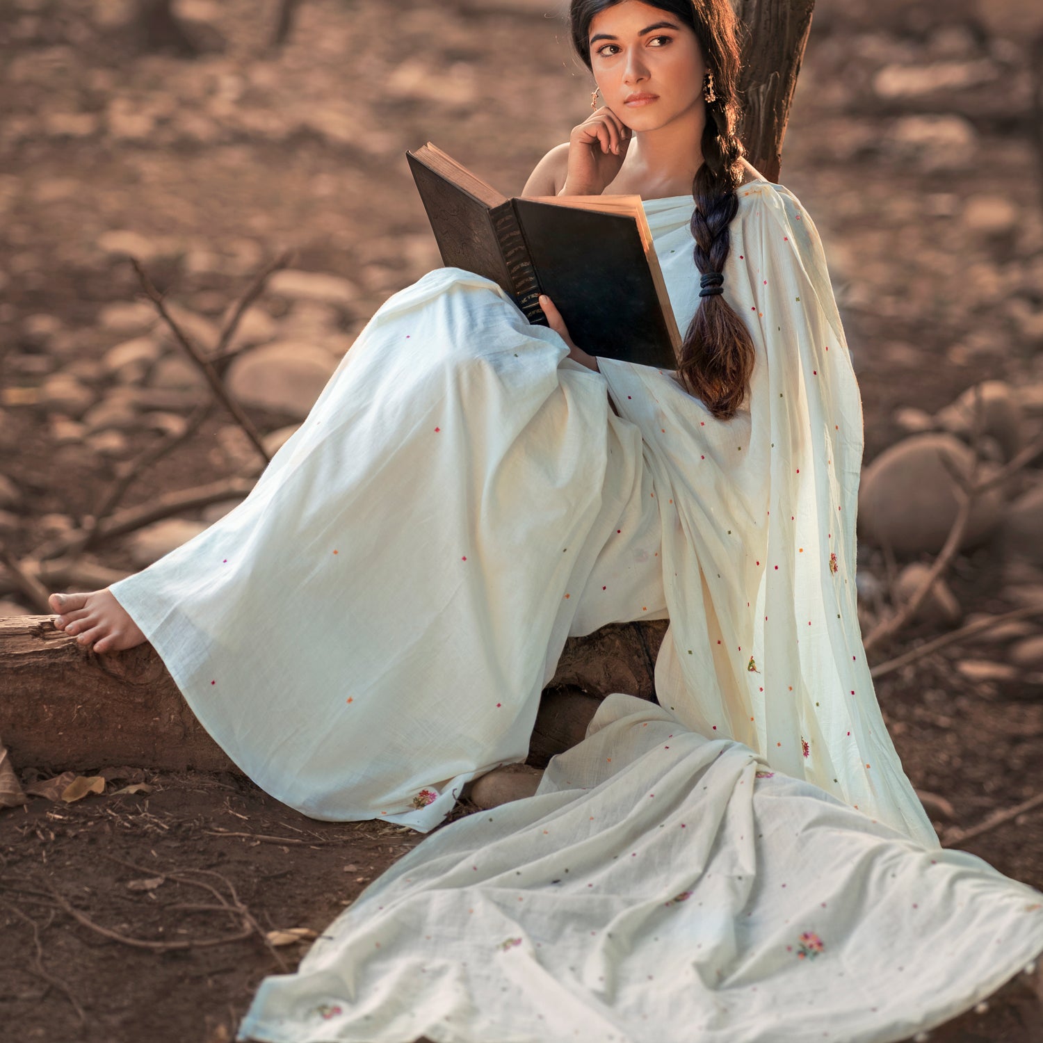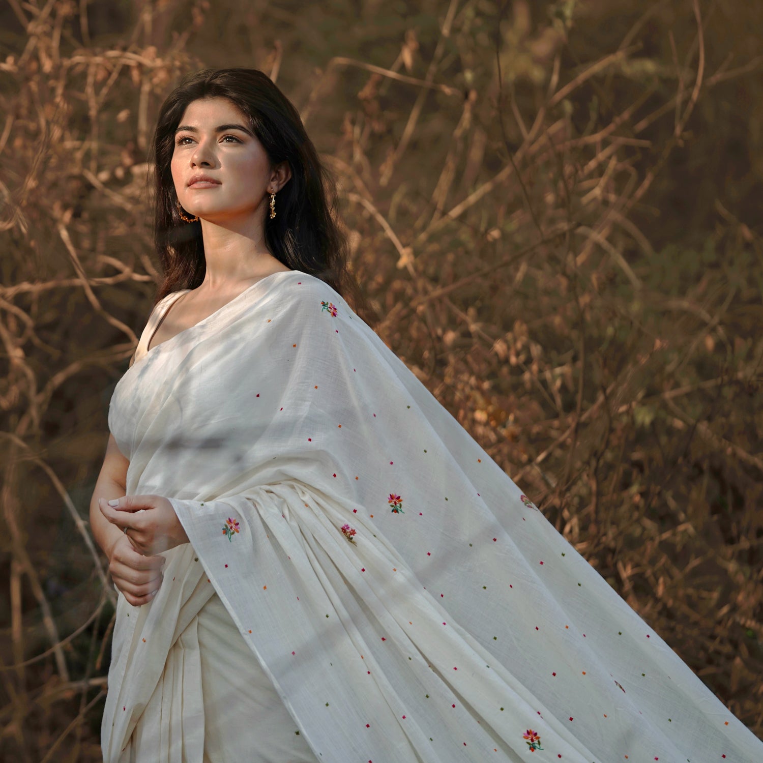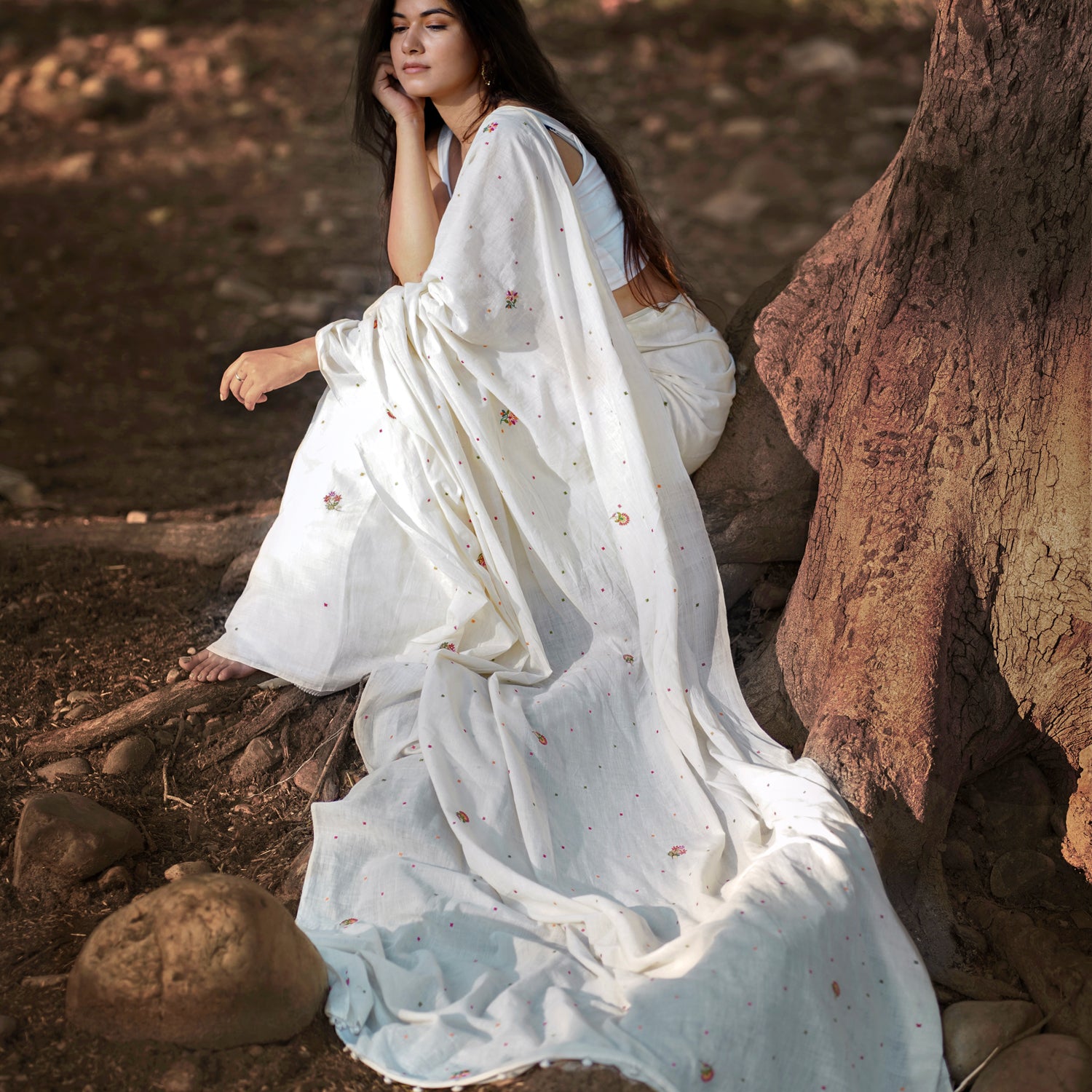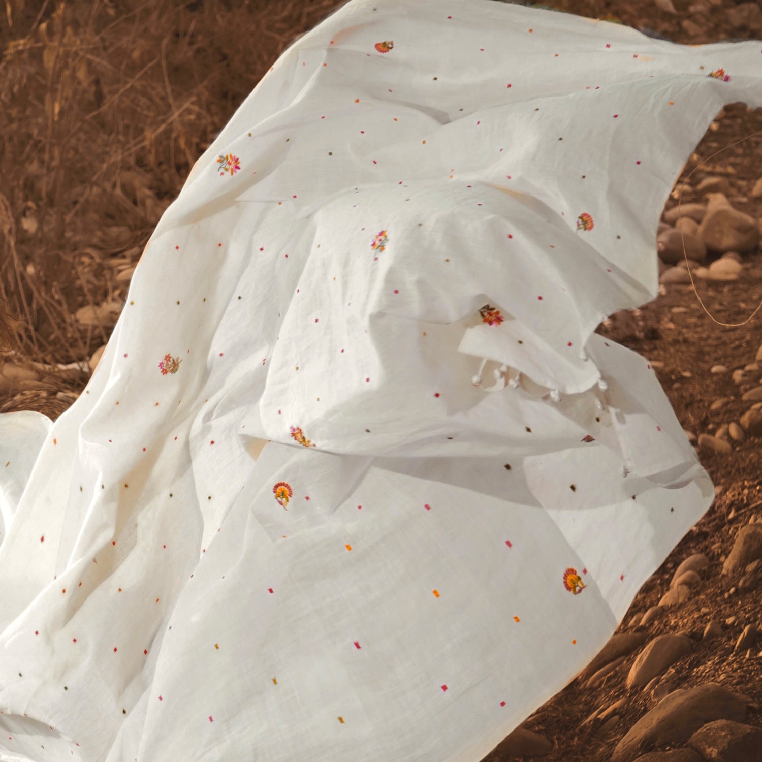 A perfect summer textile, this Vintage SPRING BLOSSOM sari is an enchanting blend of visual and sensory delight. Utter softness of 250 count hand spun, handwoven natural kora( undyed unbleached cotton) white fabric, the delicacy of the hand embroidery and the sweetness of the blossoms! It's a reminder to slow down, appreciate the simple joys of nature, and find solace in the beauty that surrounds us.